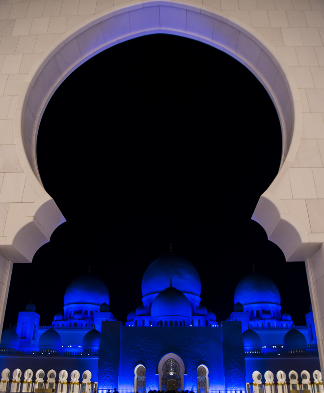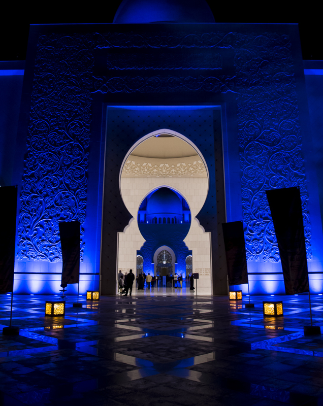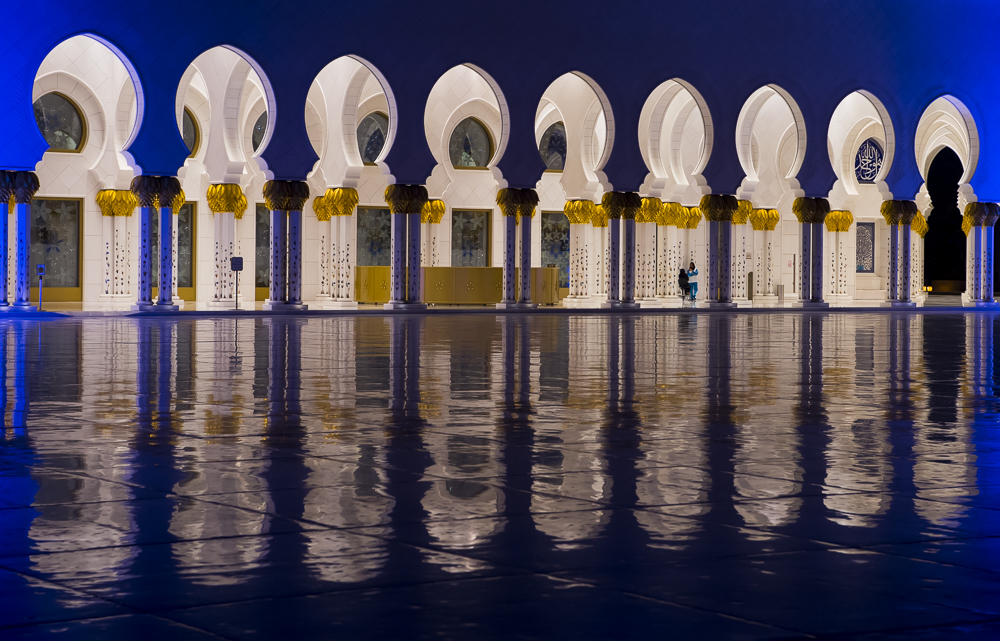 The Grand Mosque in Abu Dhabi has beautiful symmetry and many