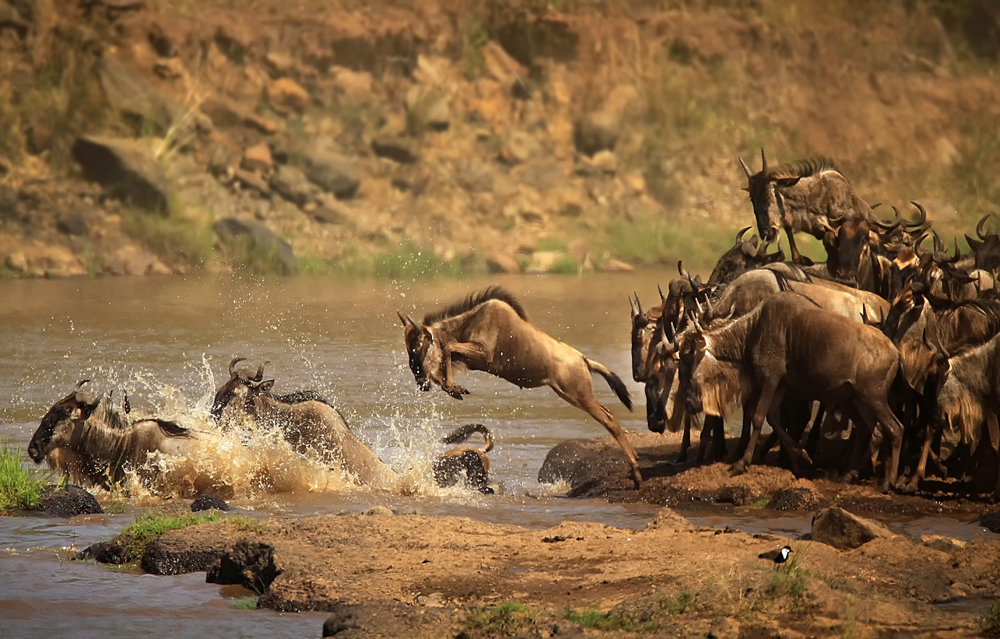ready to attack, so the wildebeest cross as fast as they can leaping as