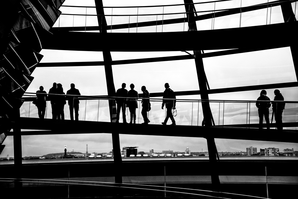 Visitors stop and gaze through the glass of the Reichstag dome,