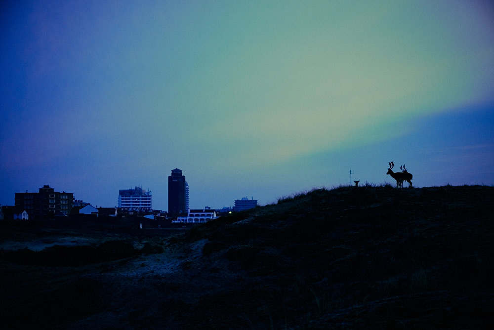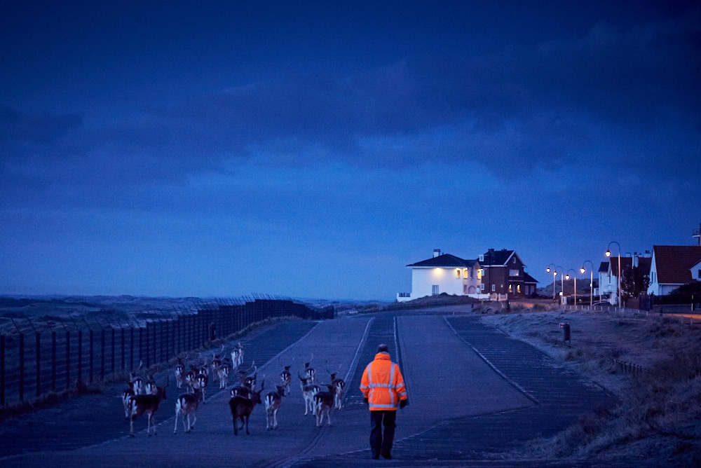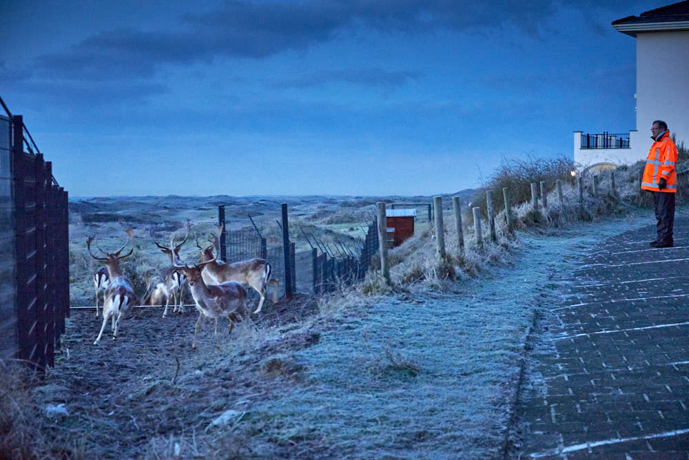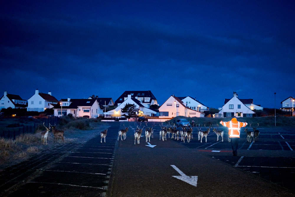 a large group of deer enter the Dutch seaside village of Zandvoort. They eat from the