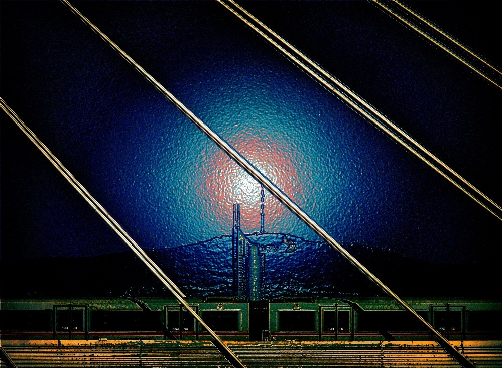 A late-night metro train of U-Bahn Linie U2 crossing over Praterbrucke