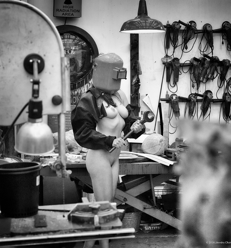 A nude in a workshop protecting her head from high radiation. This picture is as much about creative nudes as it is about the prominence of head over limbs in human affairs.