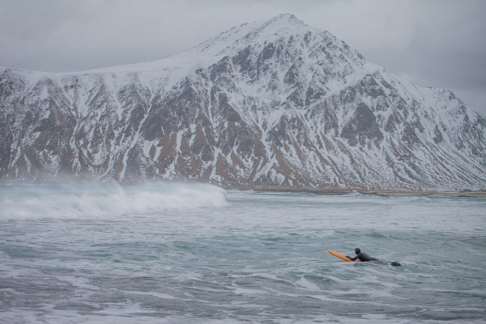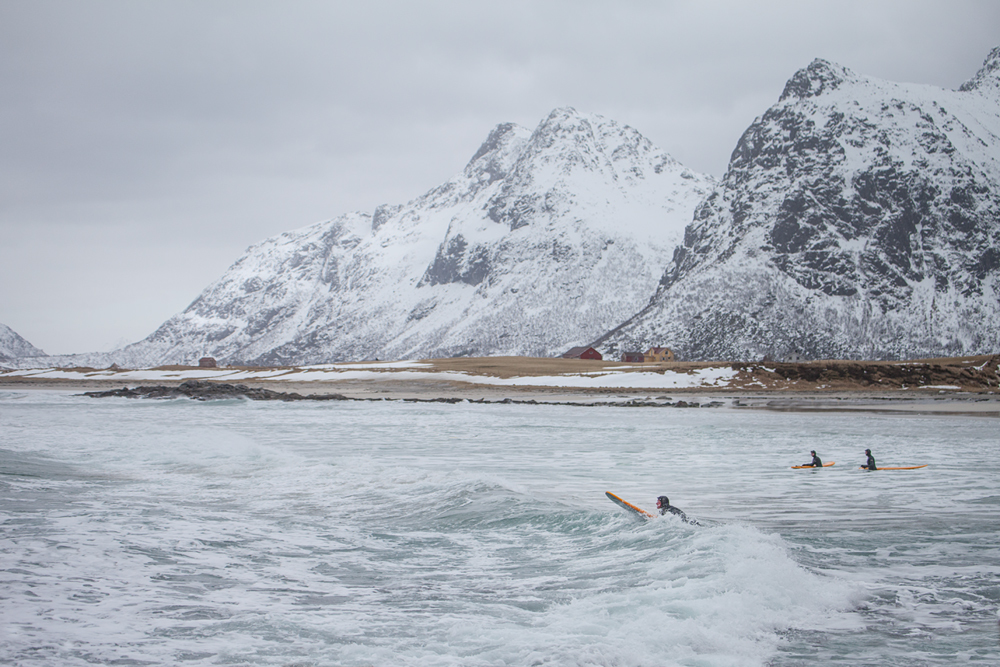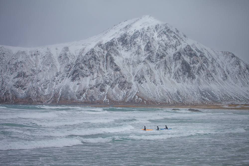 Group of surfers enjoying cold ocean waves during one winter afternoon in Lofoten.