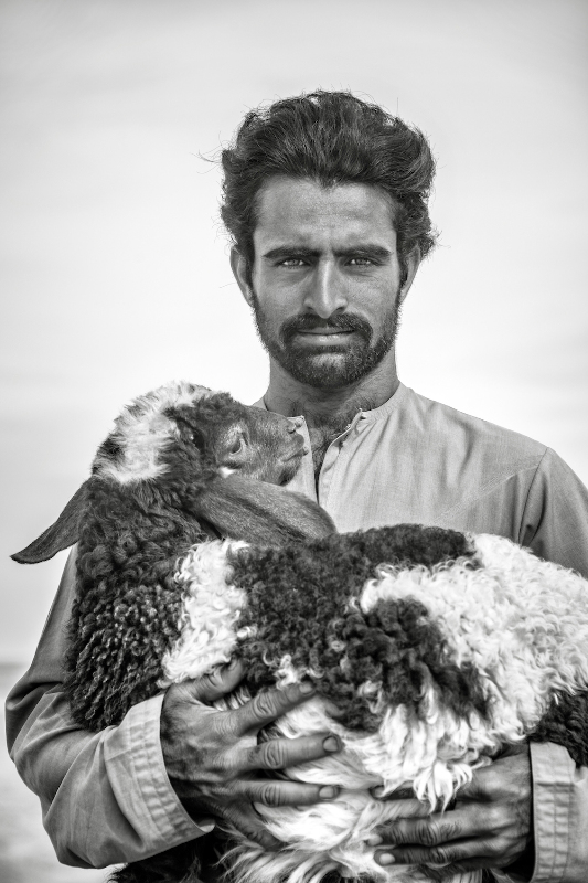 Shepherd from Pakistan, holding a baby goat. Imaged captured in