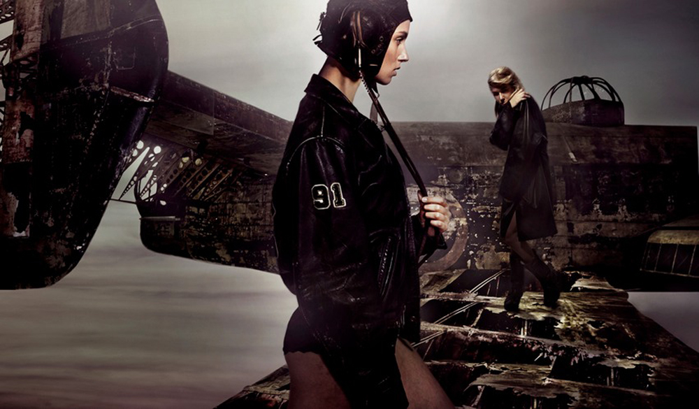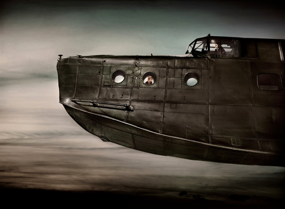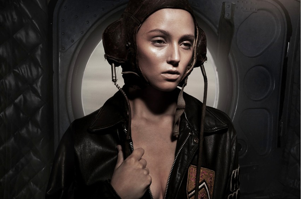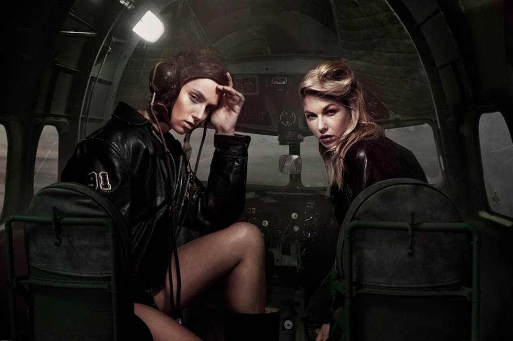 Two beautiful women travel in a ghost aircraft at night. They wear vintage fashion from a