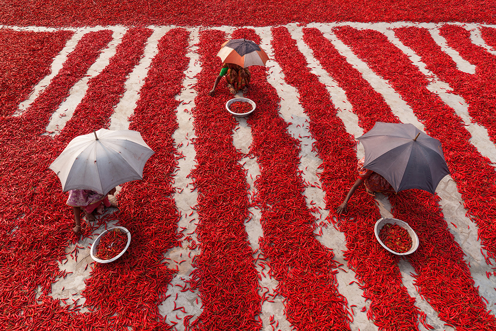 In Bogra,Bangladesh, women sorting dry dead red chillies in a red