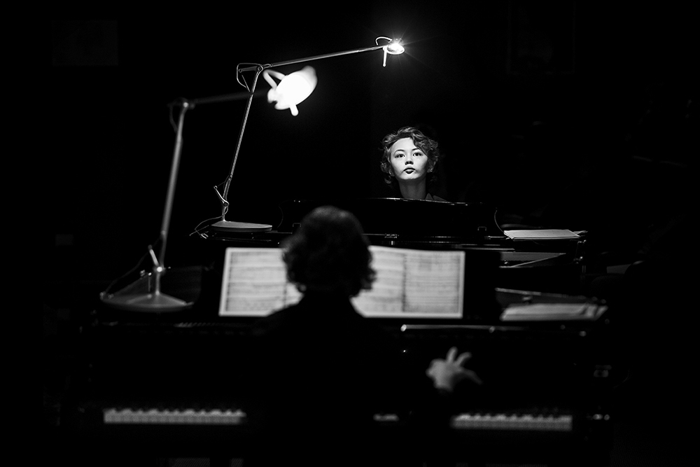 Two young pianists perform Mozart concert k.365 for 2 pianos and orchestra