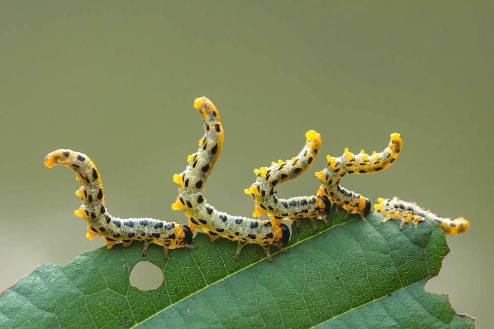 Larvae of sawfly (birch sawfly) chewing the leaf.
