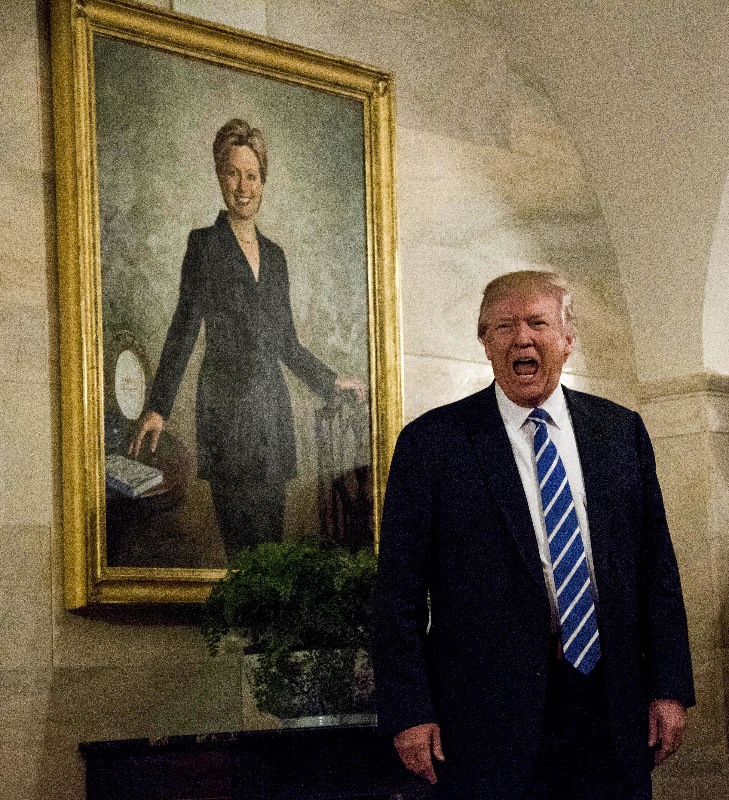 U.S. President Donald Trump walks in a corridor of the White House to greet visitors, while a portrait of Hillary Clinton hangs on the wall, Washington, DC.