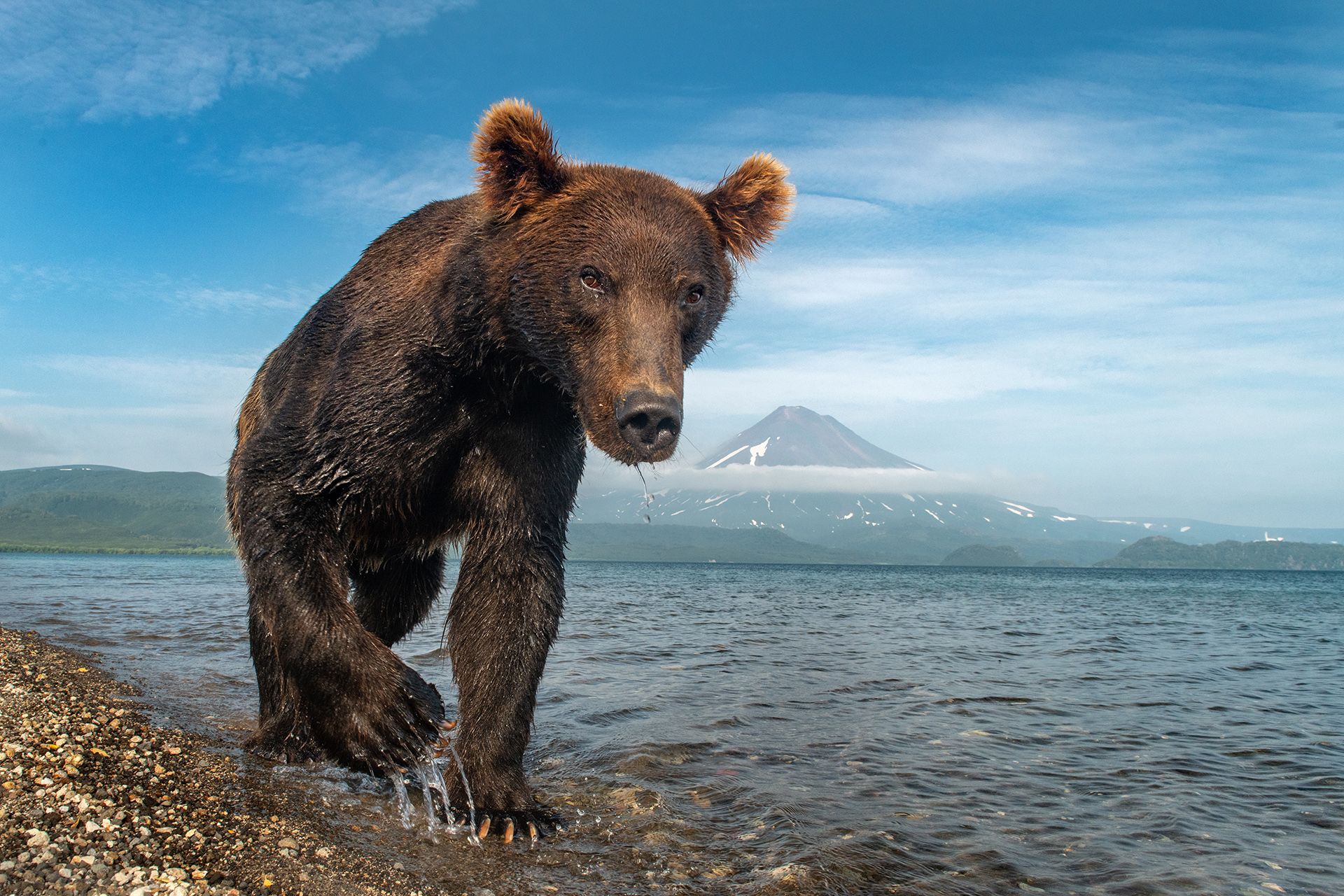 The Brown Bear walks along the shores of Lake Kuril in Southern Kamchatka, searching for the best spots to hunt Salmons. Ilyinsky Volcano in the background is one of the best known landmarks of Kuril.