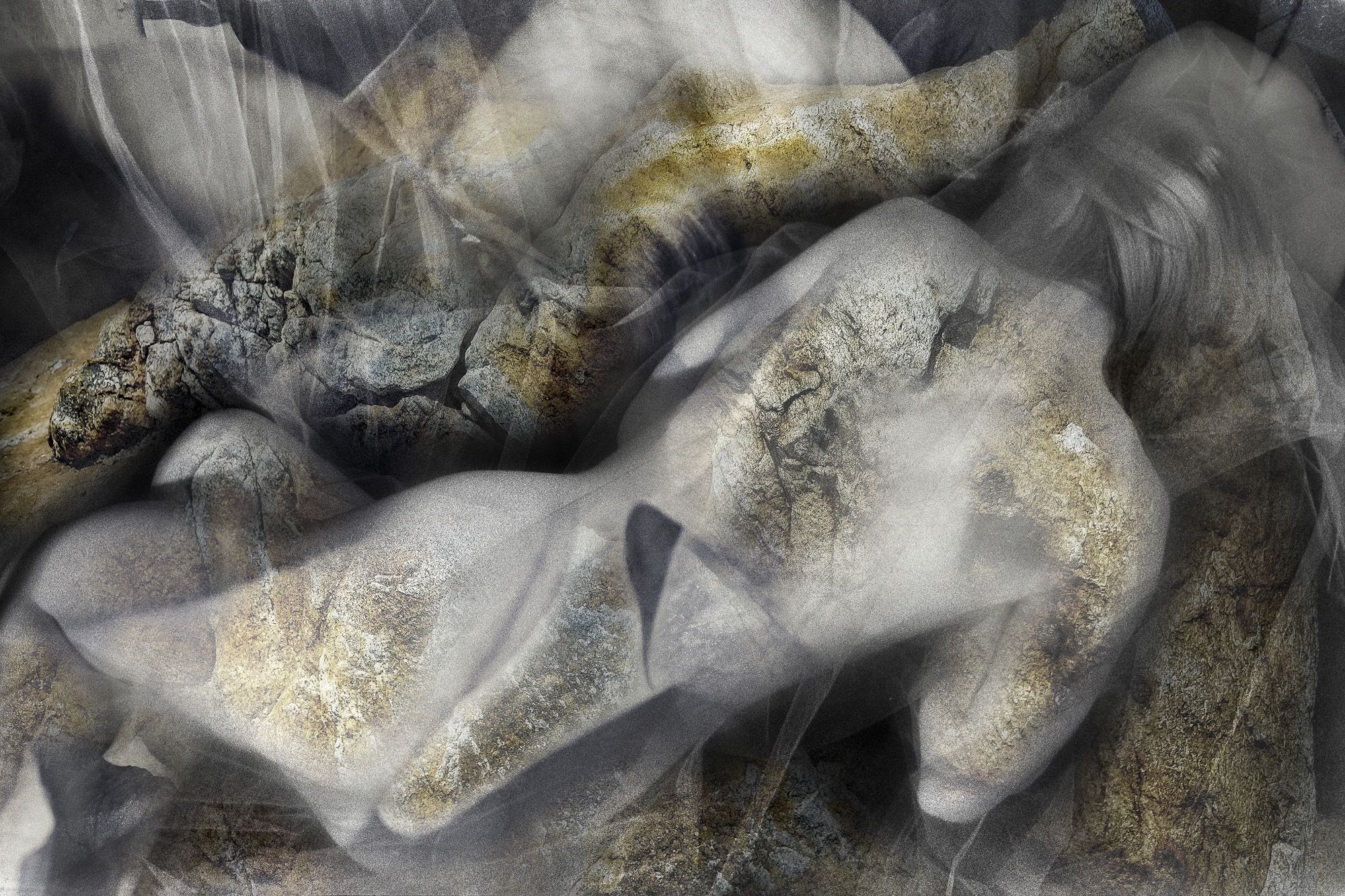 His intention both then and now, is to create a provocative image, a complex and dynamic blend that entices the viewer to look deeper. His current studies expand the use of natural elements to include landscapes during times of growth and decay. Prior use of mirrors are replaced by the reflective surface of water, and patterns of leaves or sedimentary rocks naturally suggest intricate tattoos. Stephen’s research utilizes a number of images which function in the same way that painters use brushes and paint palettes; his tools are a combination of various analog films mixed with digital media.