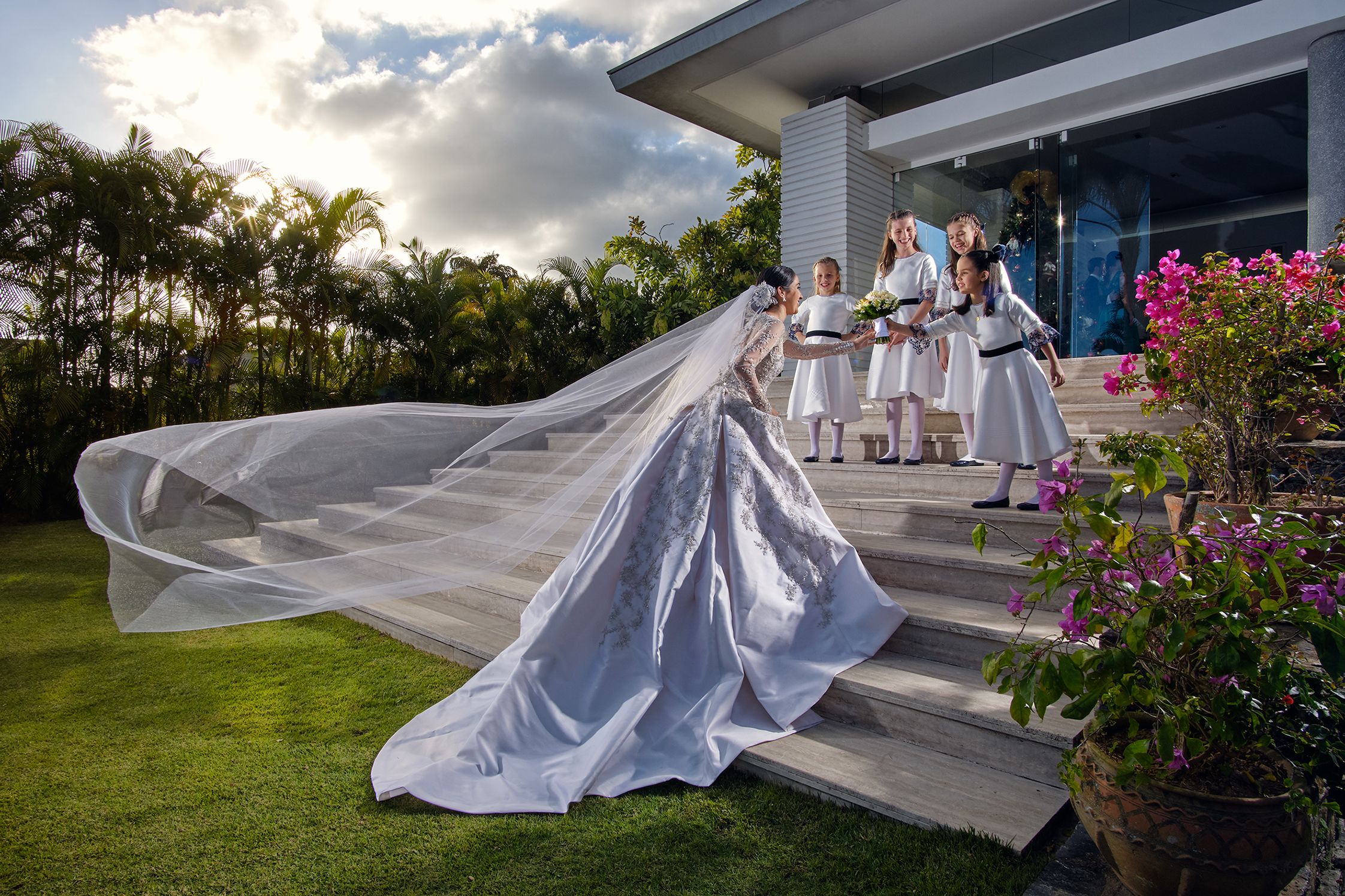 "She looks like a princess" the young girls said while the gorgeous bride was walking down the stairs with her beautiful dress on. The girls admire the bride, they wanted to help or participate, I can see it in their eyes. "My bouquet is missing" said the bride, so I asked the kind girls to get it for her and told the bride to meet them half way up the stairs so the light and composition would be the most perfect for the scene.