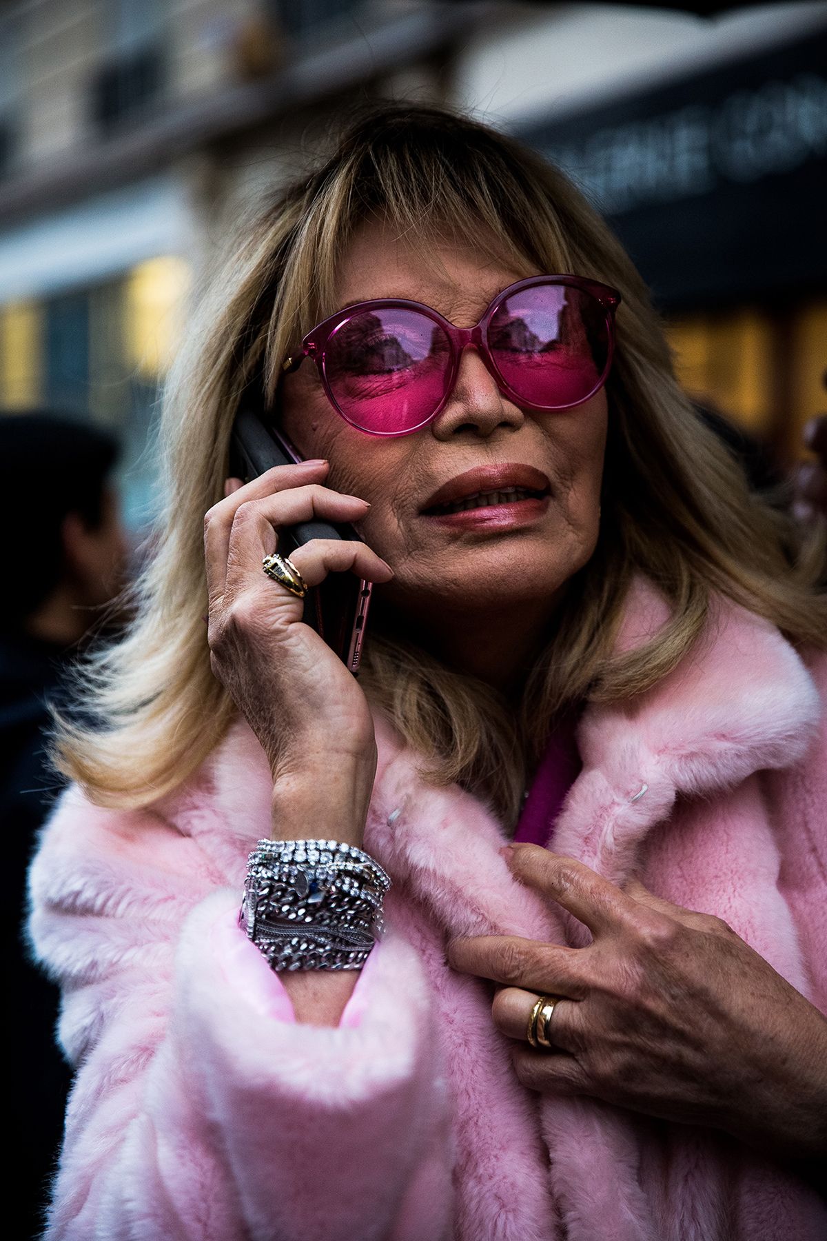 All the guests were coming out of Jean Paul Gaultier's latest fashion show in Paris, so was Amanda Lear, waiting for her chauffeur to arrive while it started to rain. I love the way you can see her skin texture under her makeup and her pink glasses which are her trademark, giving this photo its special colors.