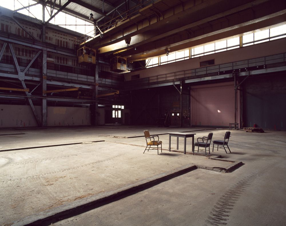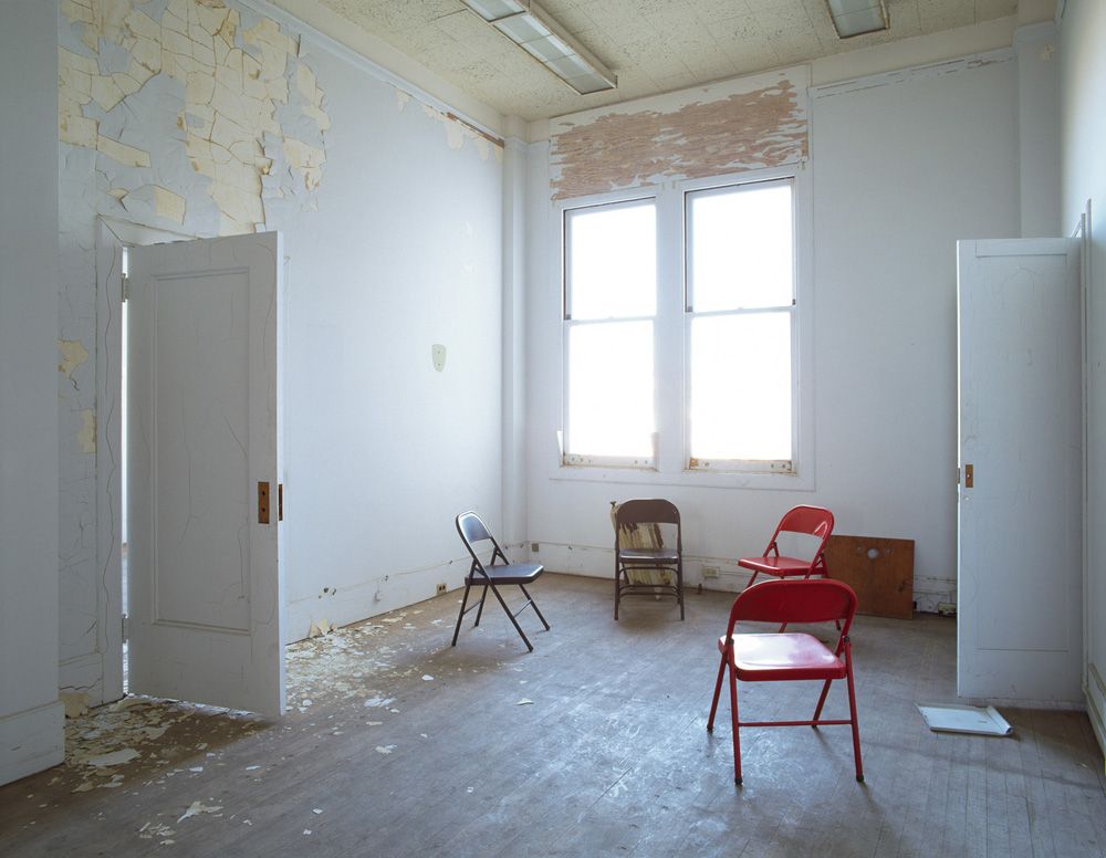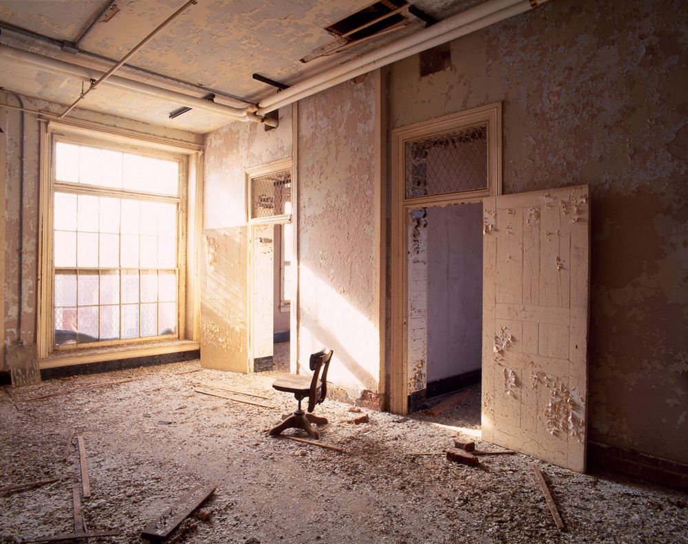 Over time I began to notice that there were solitary chairs, groups of chairs, or other seating in many if not all of the closed or abandoned mines, mills, prisons, shipyards, hospitals, and other sites I was working with. They were always artfully set up, often by windows, often in beautiful light. It is easy to imagine an individual sitting in the light, or a group meeting.