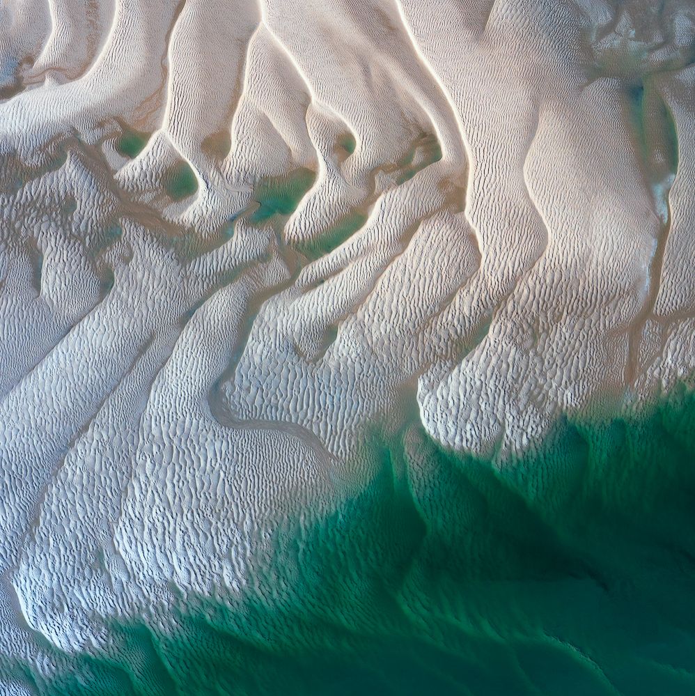 From the air, the swirling sand and waters of the Dampier Peninsula evoke a gold and jade jewel-toned beach and thus, also remind me of the jade jewellery that my mother wore while I was growing up. More literally, this scene makes you want to get on the ground to explore each of the pathways through the sand, experiencing each of the little green pools of water and the main body of water along the way.