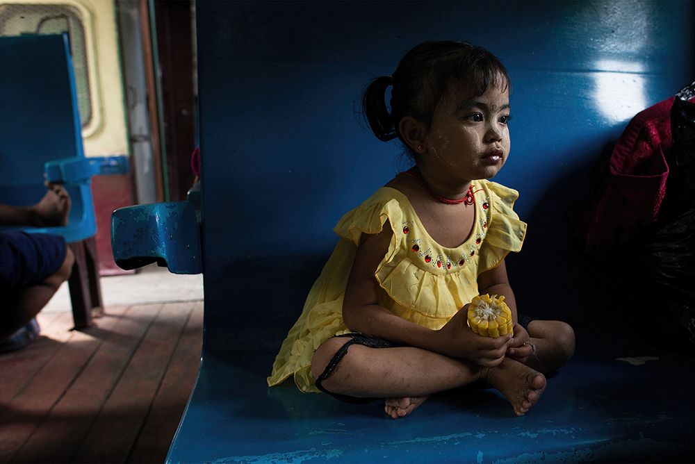 The upper class carriages on the Yangon to Mawlamyine train can be quite boring, which is why I decided to visit the ’regular’ class. The atmosphere there was pretty lively and the interaction among my fellow passengers very animated and entertaining. It was here that I spotted this child eating a cob of corn. I was lucky that the god of light was looking down on me as I took this shot . . .