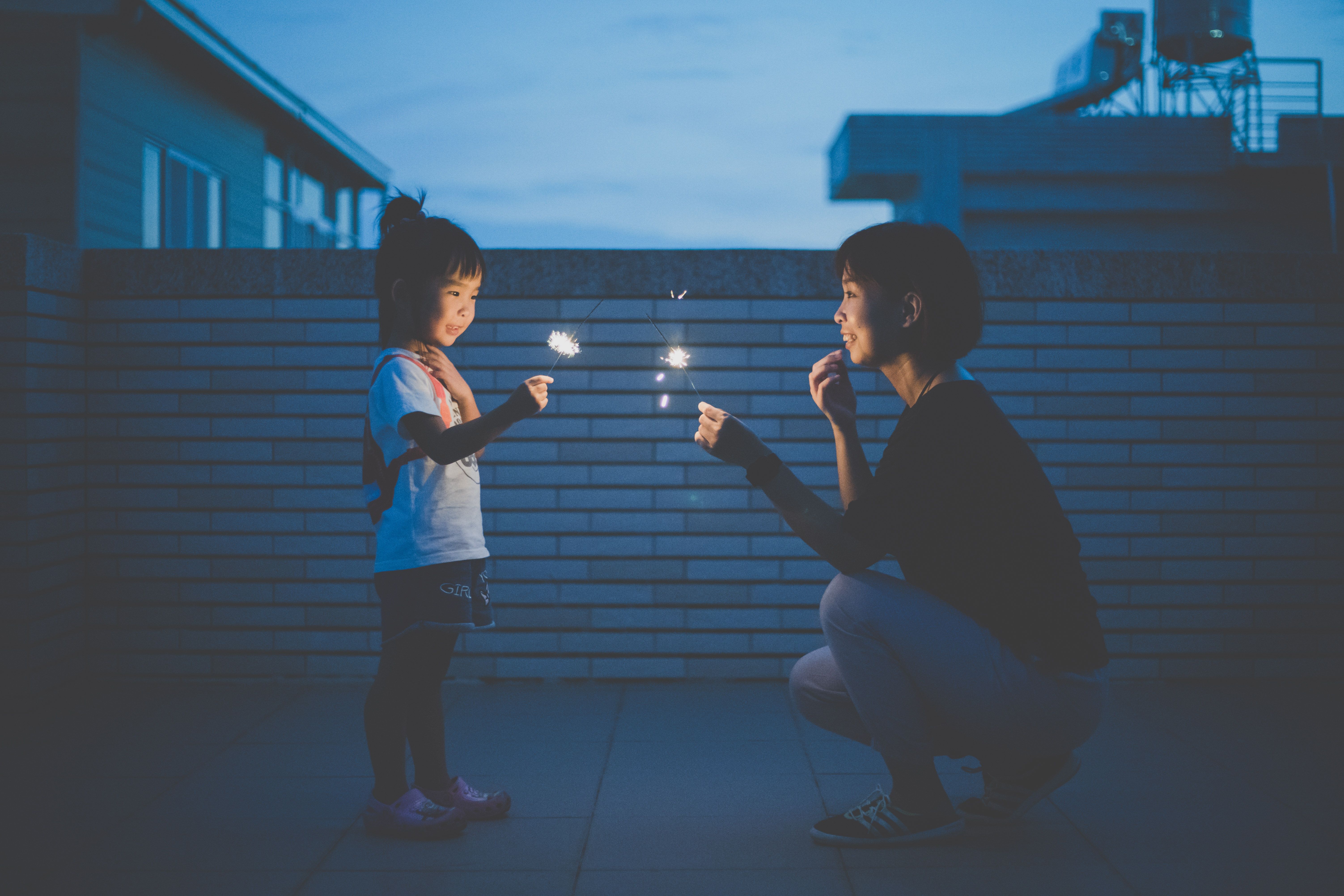 Playing fireworks at the Mid-Autumn Festival is a custom in Taiwan. That night, my daughter and wife played fireworks on the top floor. I took this picture with my camera.