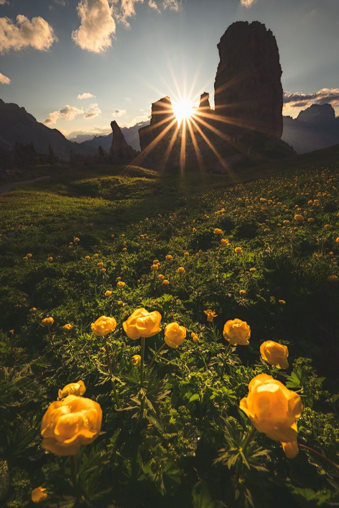 The light of the sun from the rocky shade made the fresh flowers shine beautifully.
