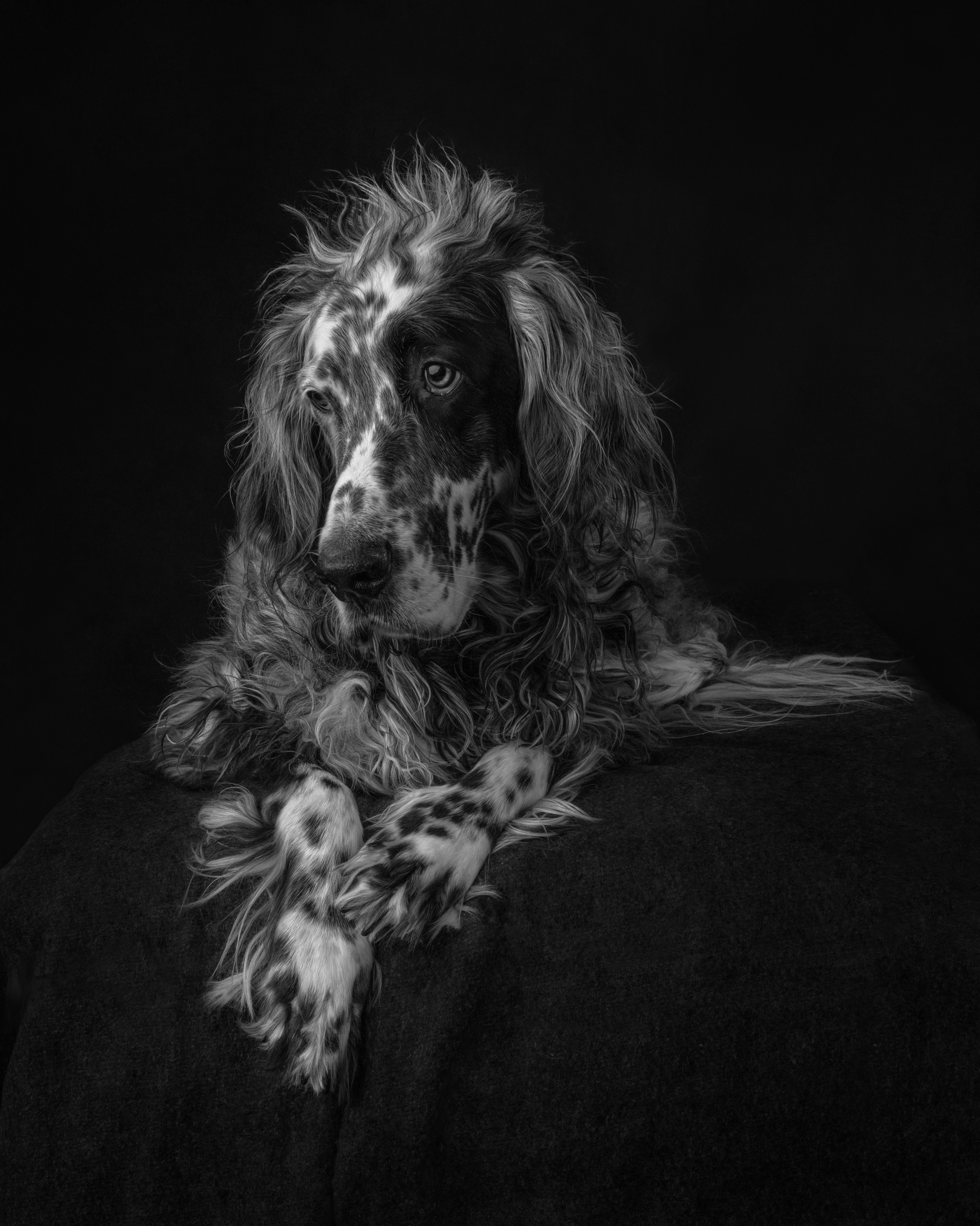 A black and white English Setter daydreaming. These glorious dogs are so graceful and thoughtful.