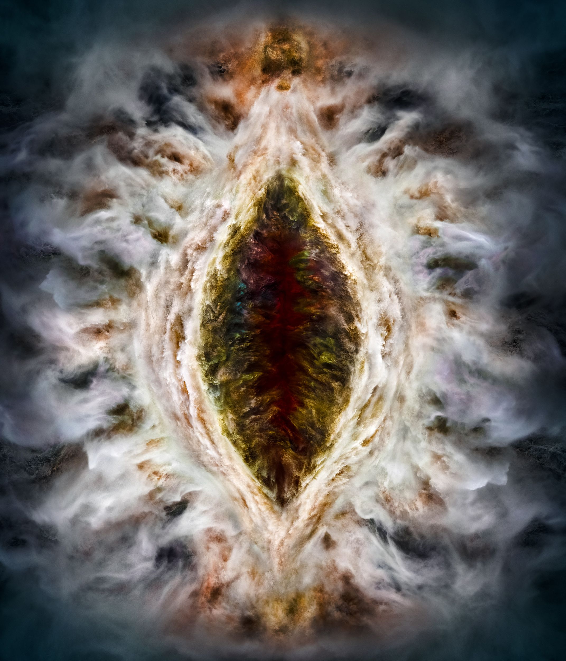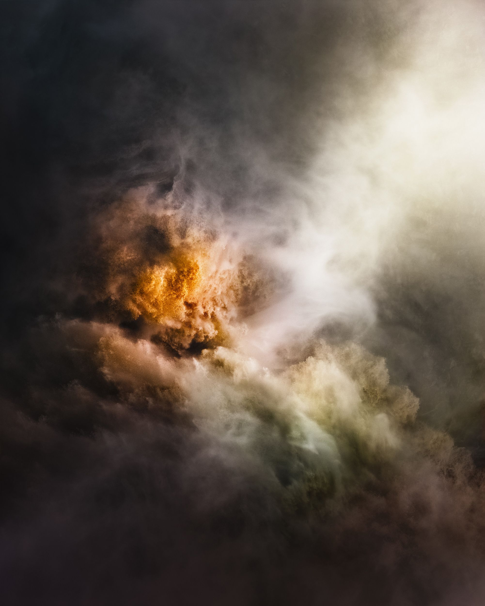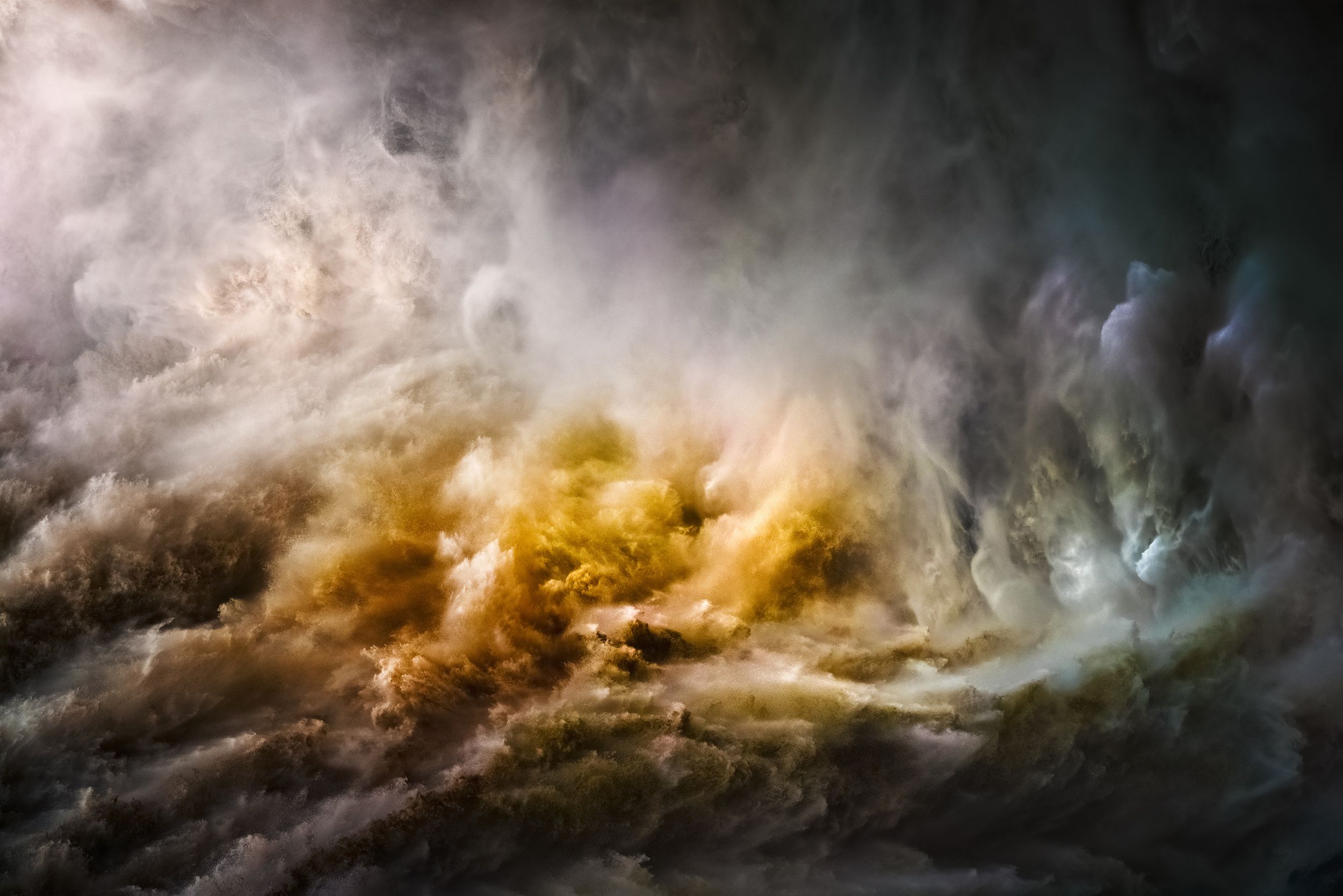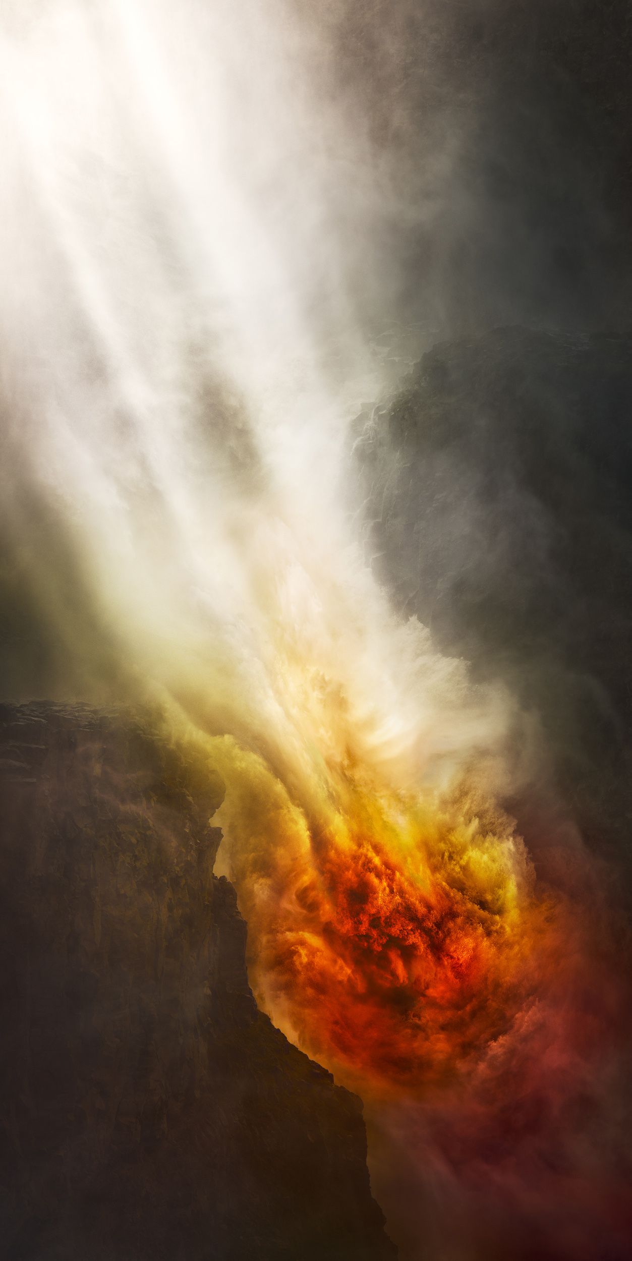 The "illuminated spaces" series tries to express, in a pictorial and colorist way, the endless energy of our origins. The elements collide to sketch dreamed landscape of the universe. Water, air and fire are melted into a unique maelstrom able to create and destroy life. The waterfall is the perfect symbol of it : Space and Time flow in a violent and fruitful revolution, reaching us into a new and invisible frontier. As an endless eruption of fire and light, these massive fine art prints aim to encourage us to meditate on the telluric, organic and spiritual nature of our origins.