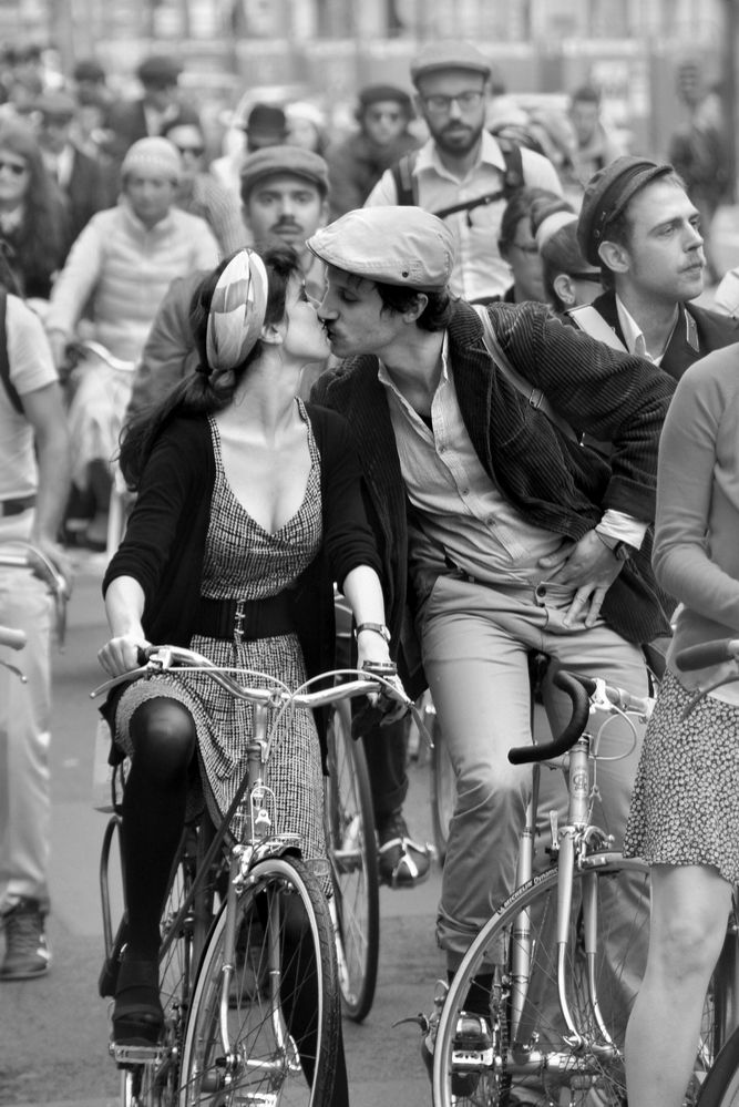 Picture taken at Boulevard Saint-Germain in Paris, during the bike ride "Beret-Baguette". The cyclists stopped at a red light and the young couple began to kiss. I was just on the opposite side of the street and had few seconds to raise the camera and press the button.