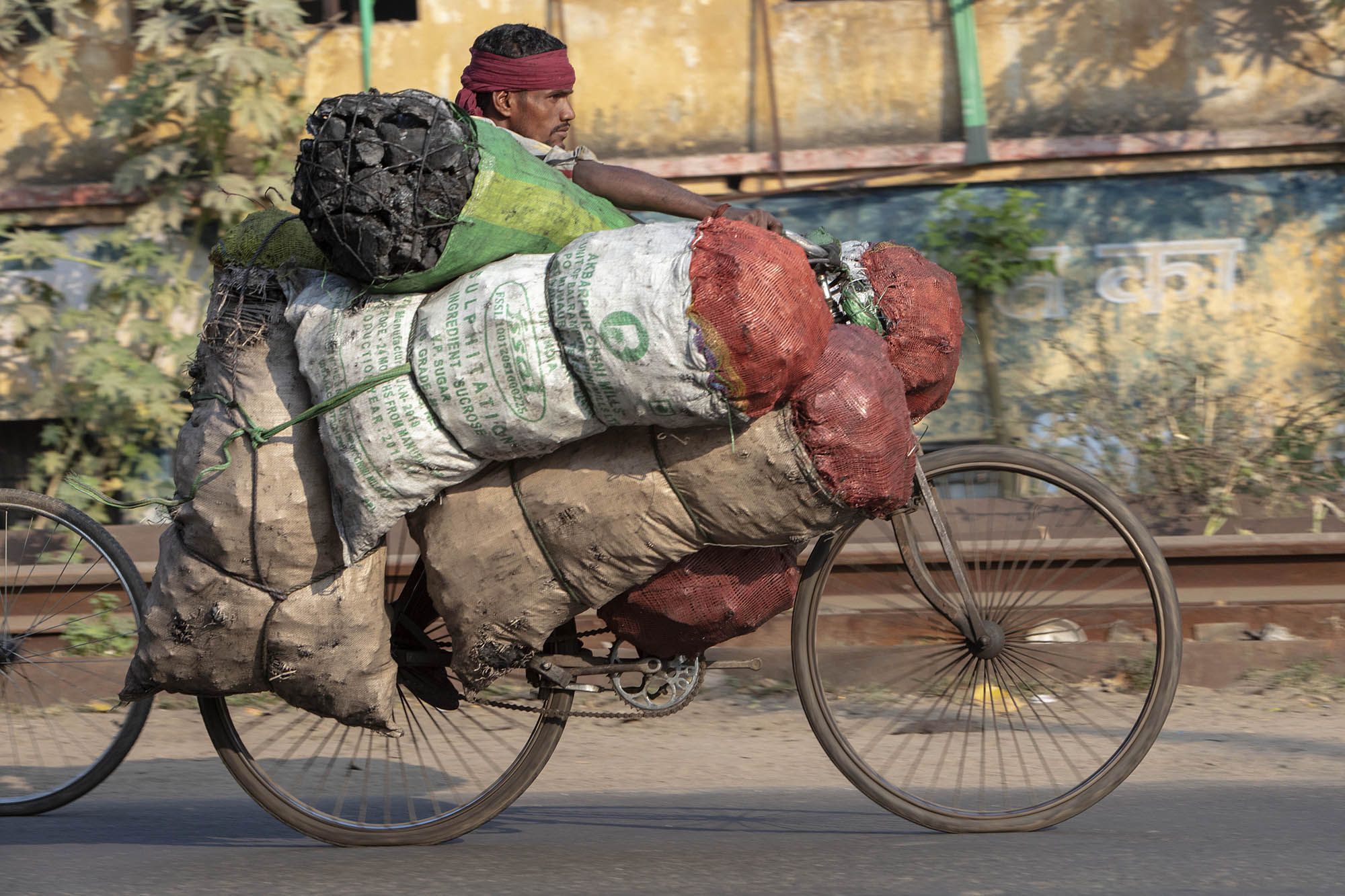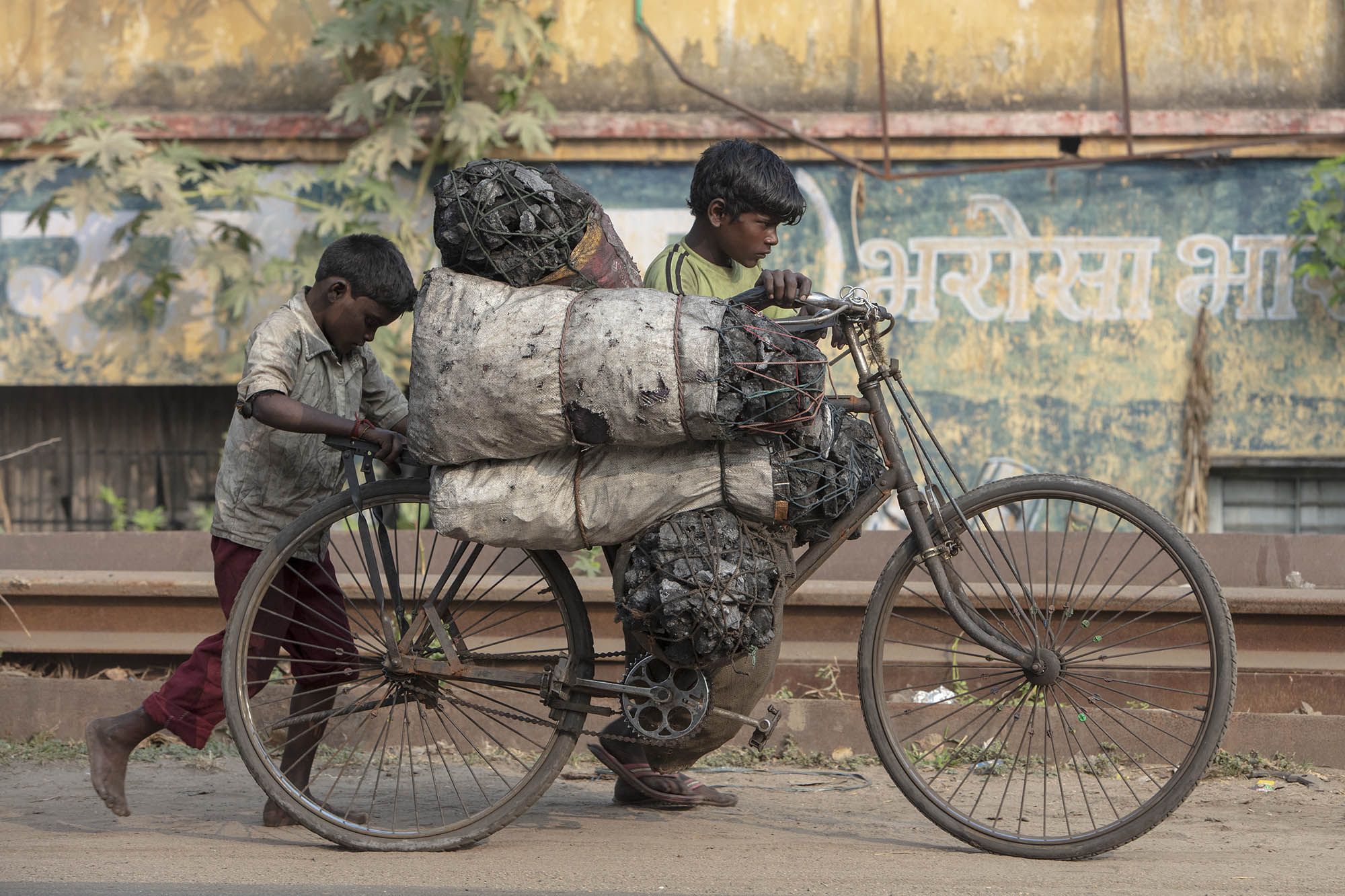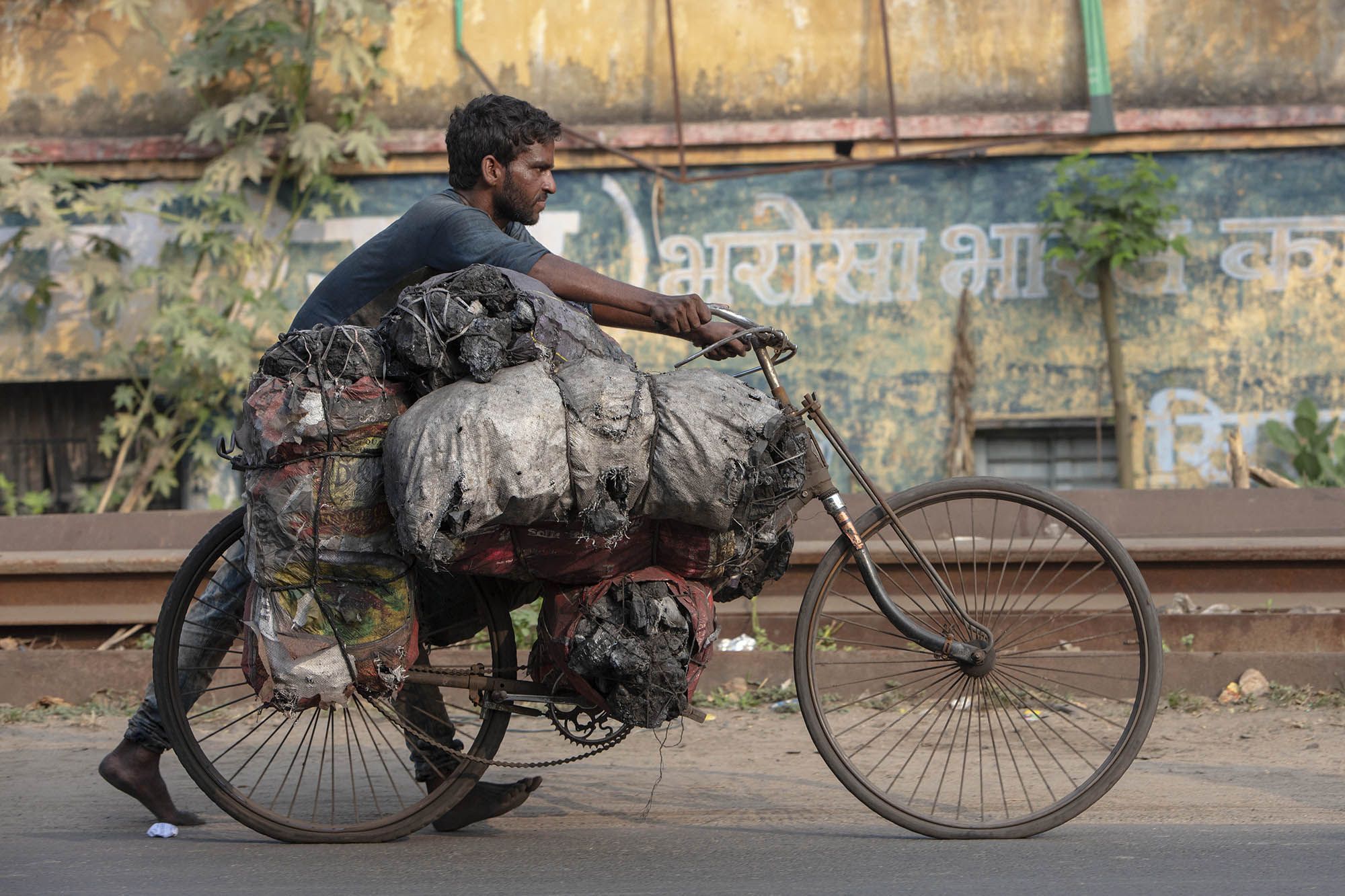 Every morning, men and boys are busy moving illegally scavenged coal in bags stacked on overloaded bicycles along the streets of Dhanbad. Dhanbad is the “coal capital” in Jharkhand state in India. These men and boys worry they will be stopped by police. If they are stopped, bribes work to pay off officials which eats in to their meager earnings. One bag of coal fetches between 150-160 rupees but the price is negotiable. They push their bicycles along, at times lucky enough to roll downhill, always looking over their shoulders to see if they are about to be stopped by police.