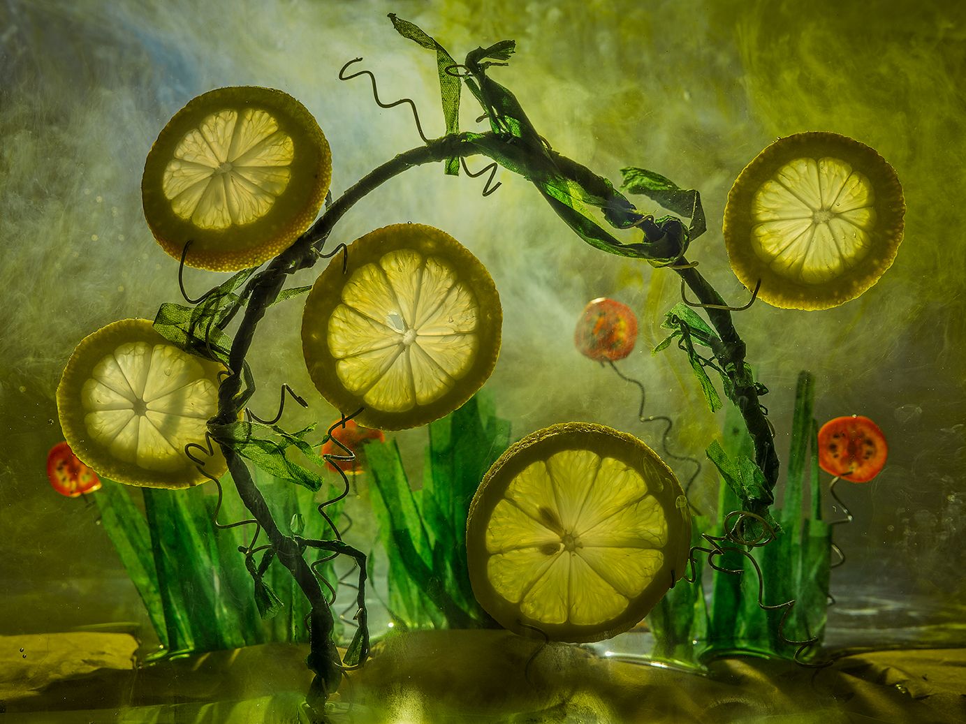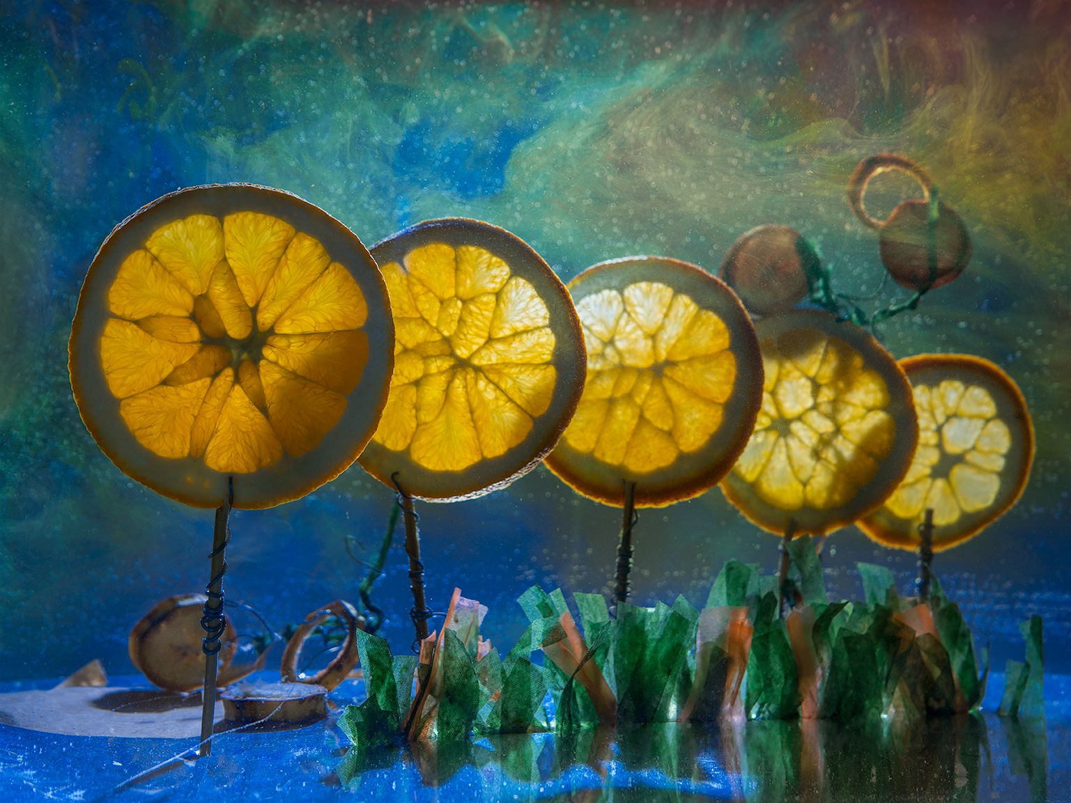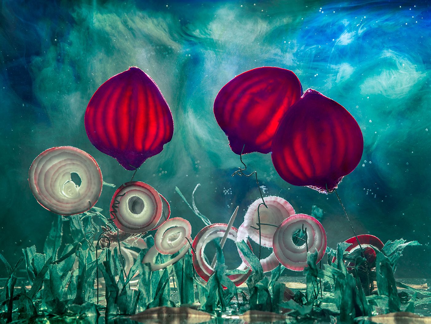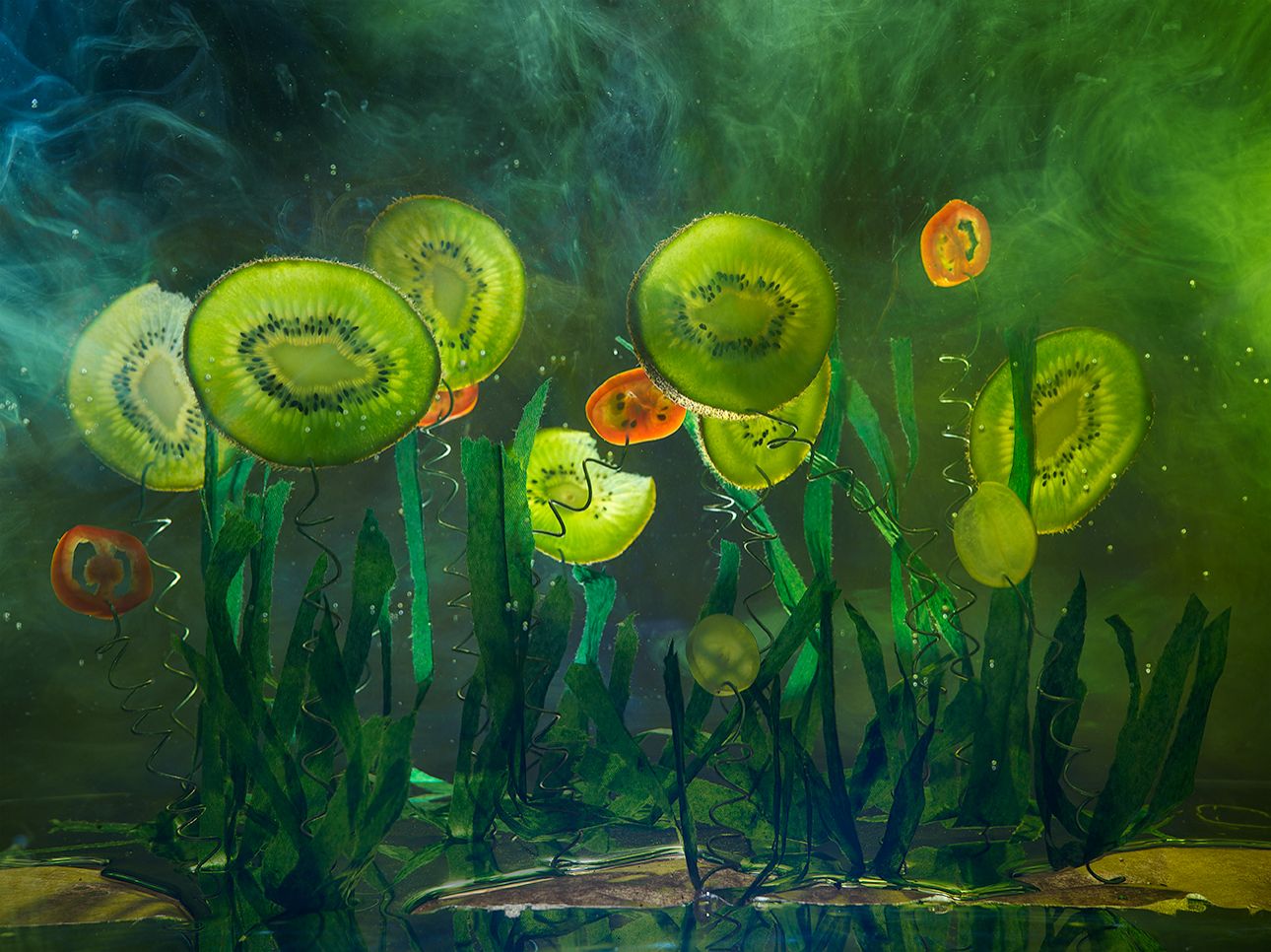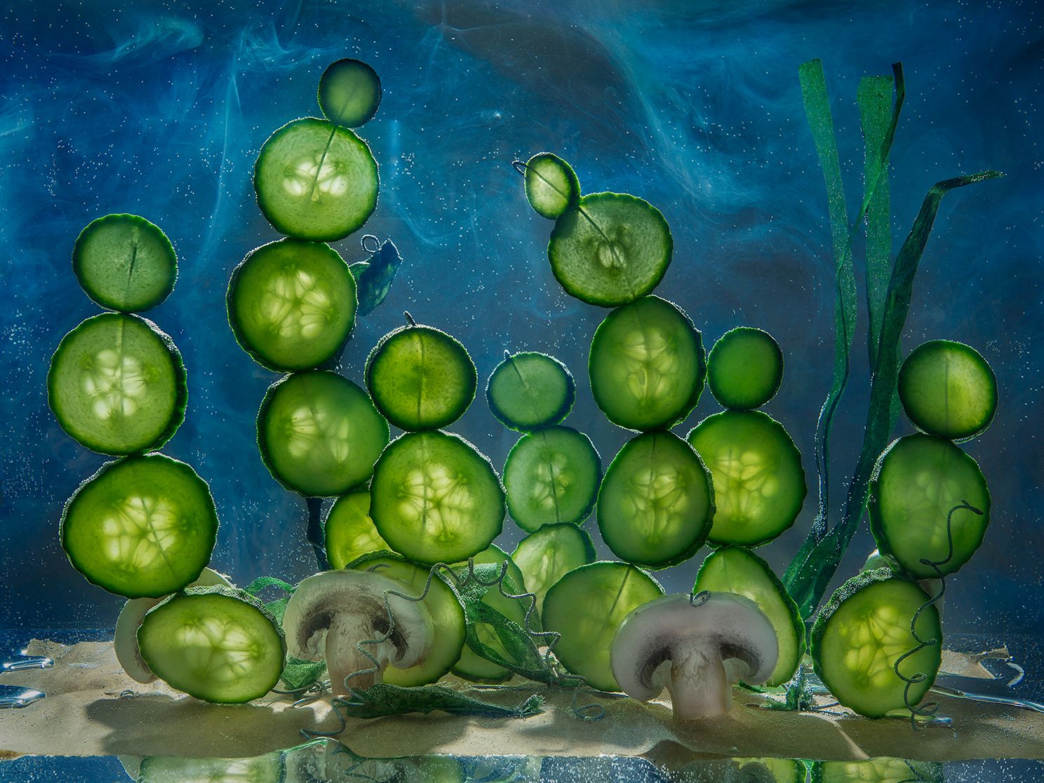 For this series I arranged Fruits and Vegetables on a frame and put it upside down in an aquarium filled with water. I also colored the water to achieve the nebula.