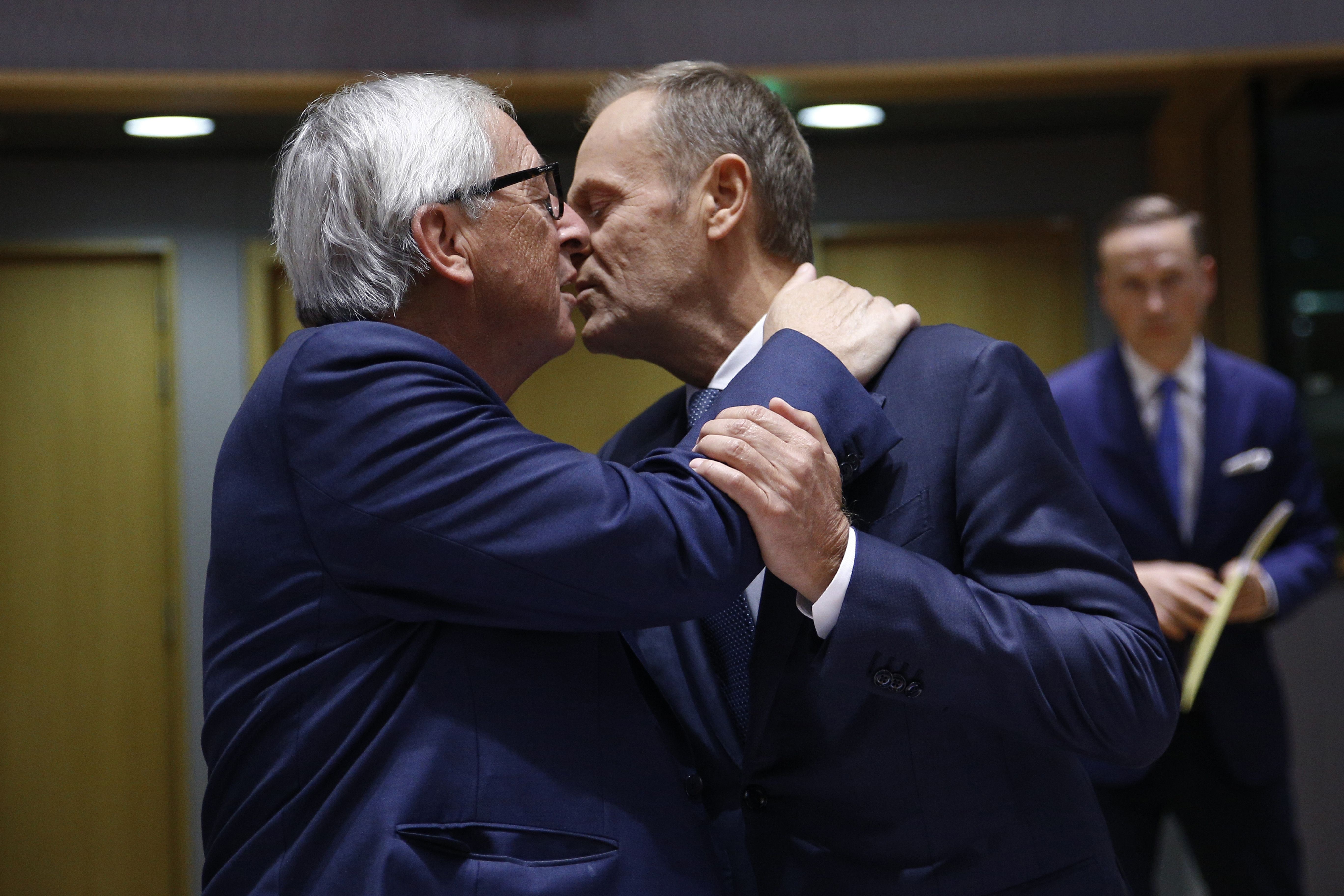 Brussels, Belgium. 16th Oct 2018.EU Commission President Jean-Claude Juncker (L) and European Council President Donald Tusk (R) during the Tripartite Social Summit