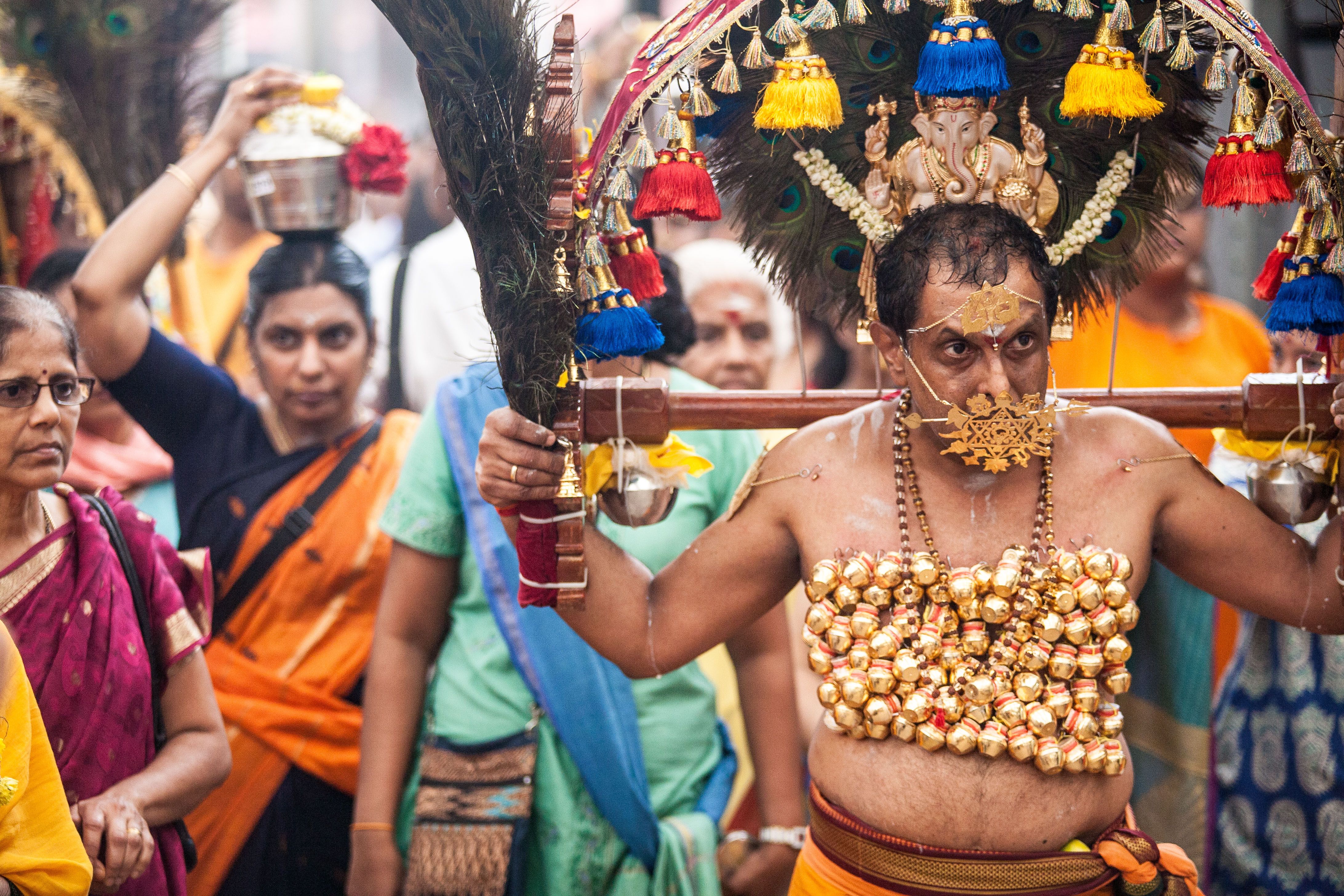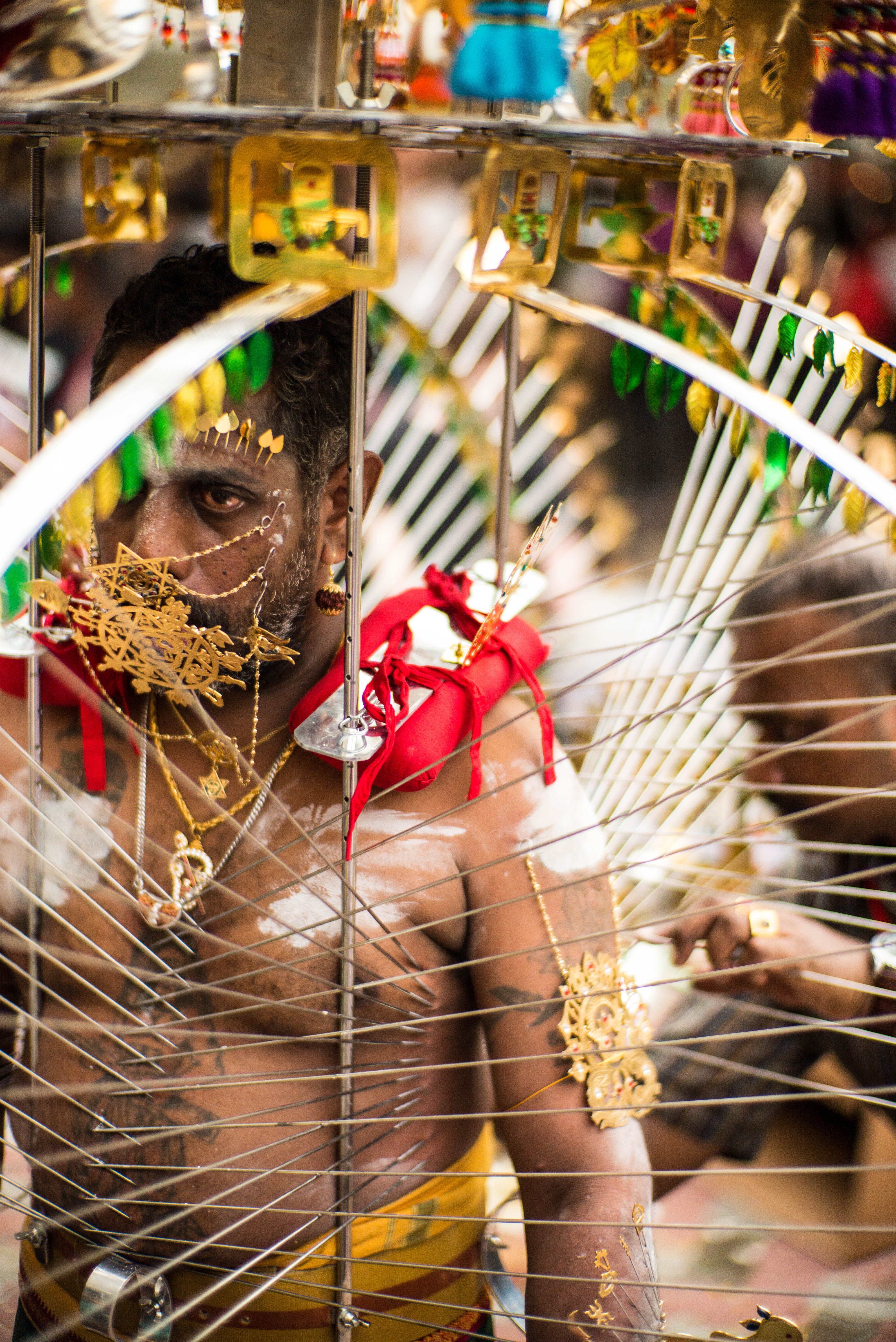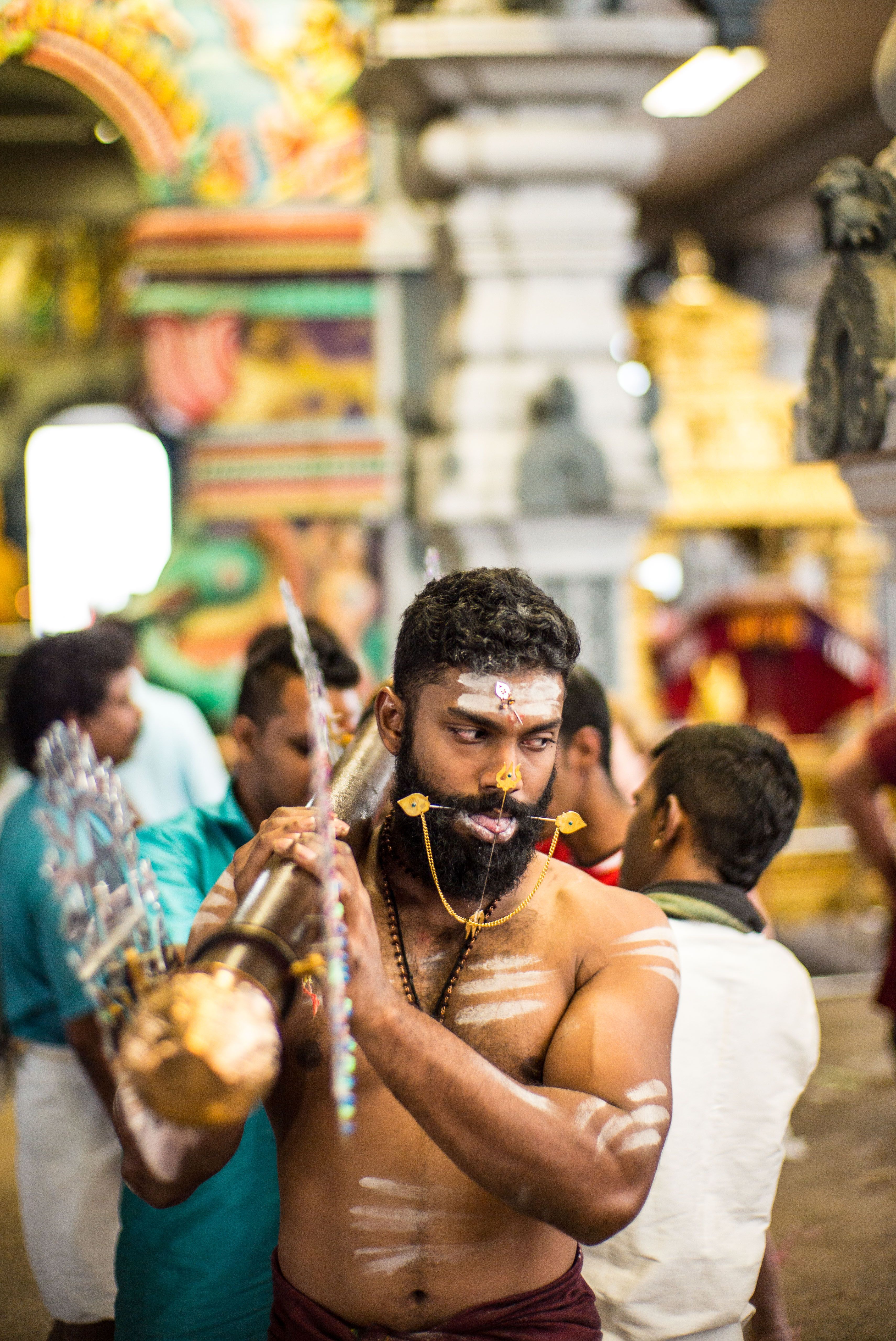 Originated from Southern India, Thaipusam is a temple festival celebrated by Tamil in Malaysia and Singapore, on January / Februeary each year. Often, sharp skewers are pierce through the tongues, cheeks and bodies of kavadi-bearers as a practice of self-modification. Carrying a kavadi is a form of seeking for forgiveness, keep a vow or offer thanks to Lord Murugan, it also translate as "sacrifice at every steps."
