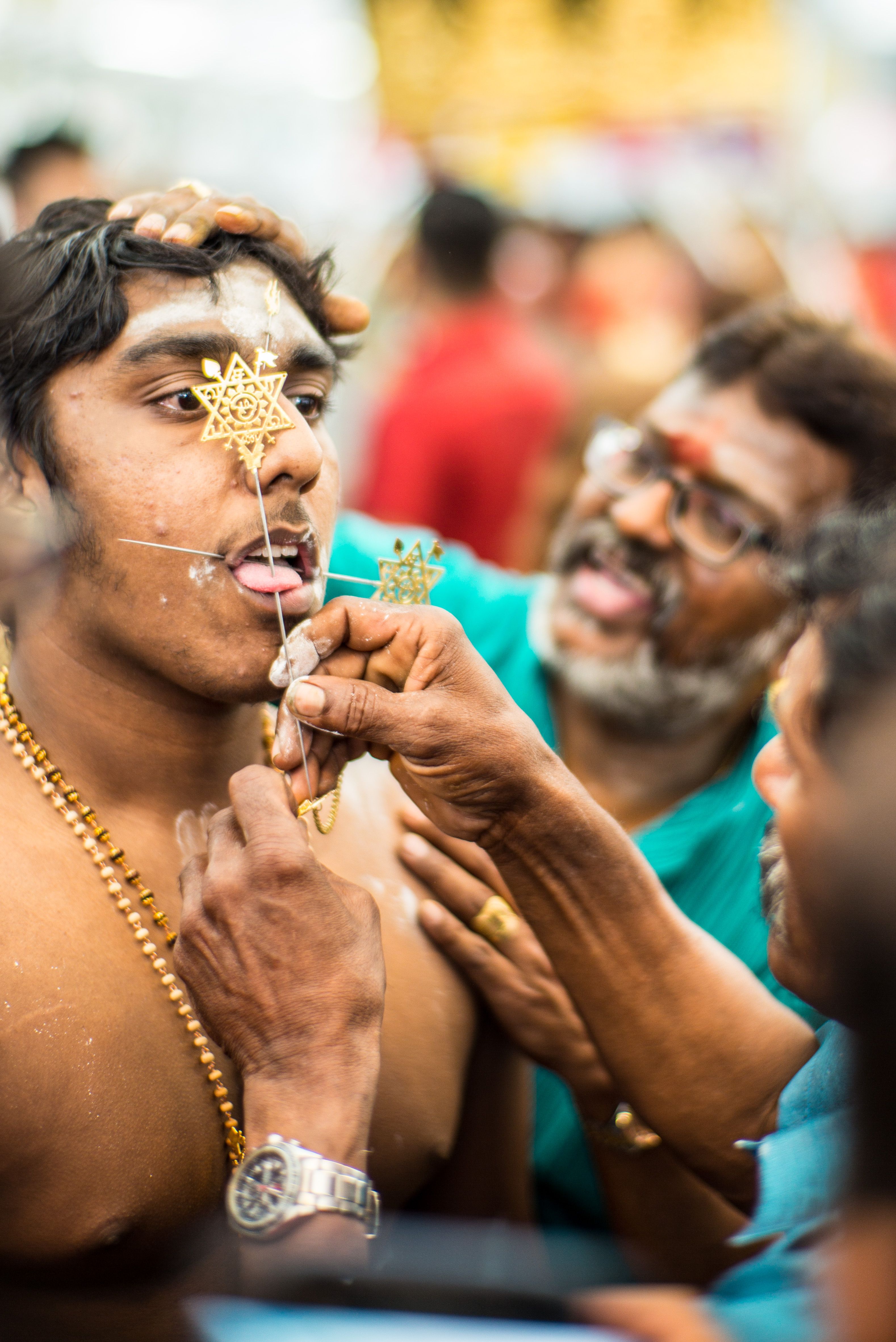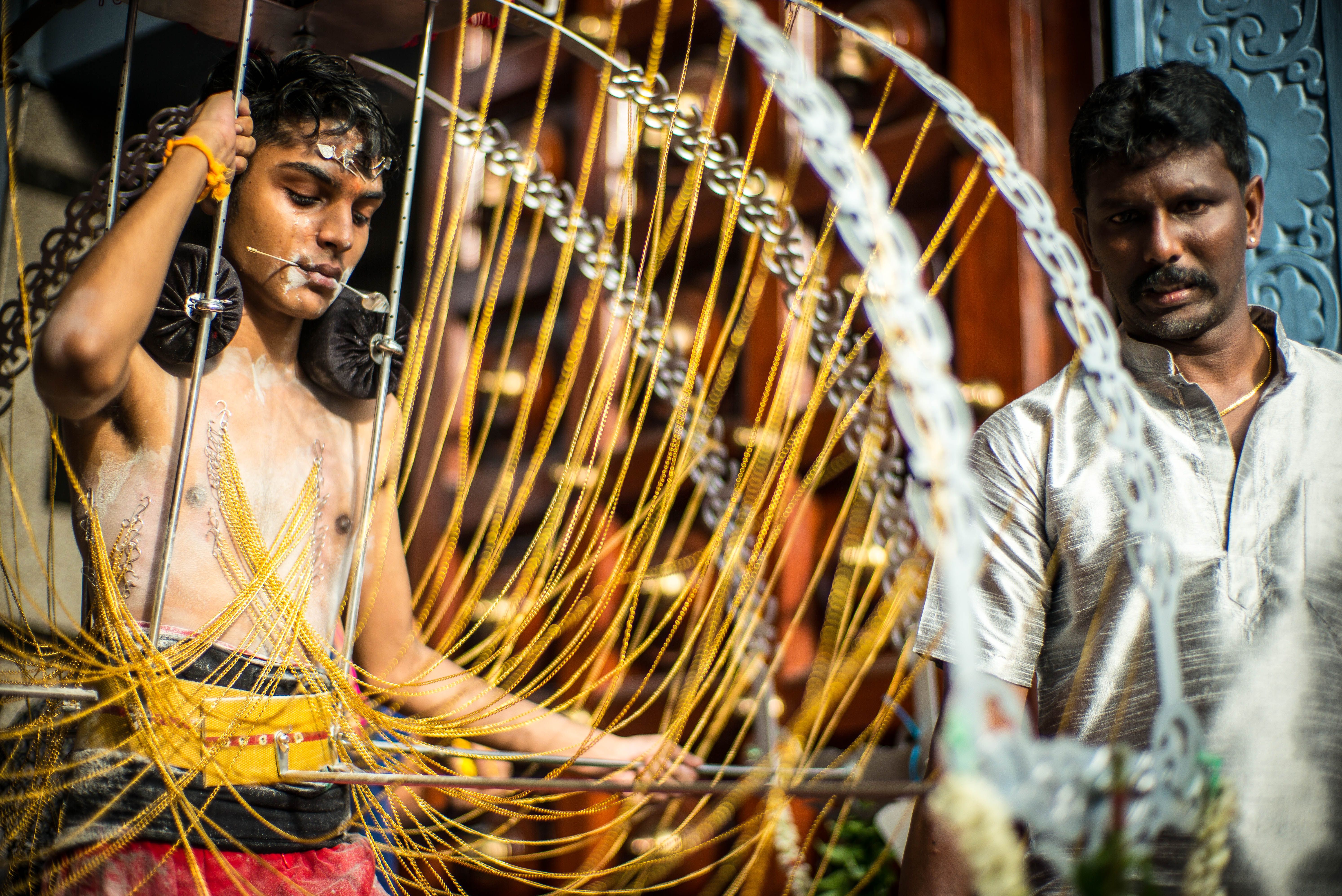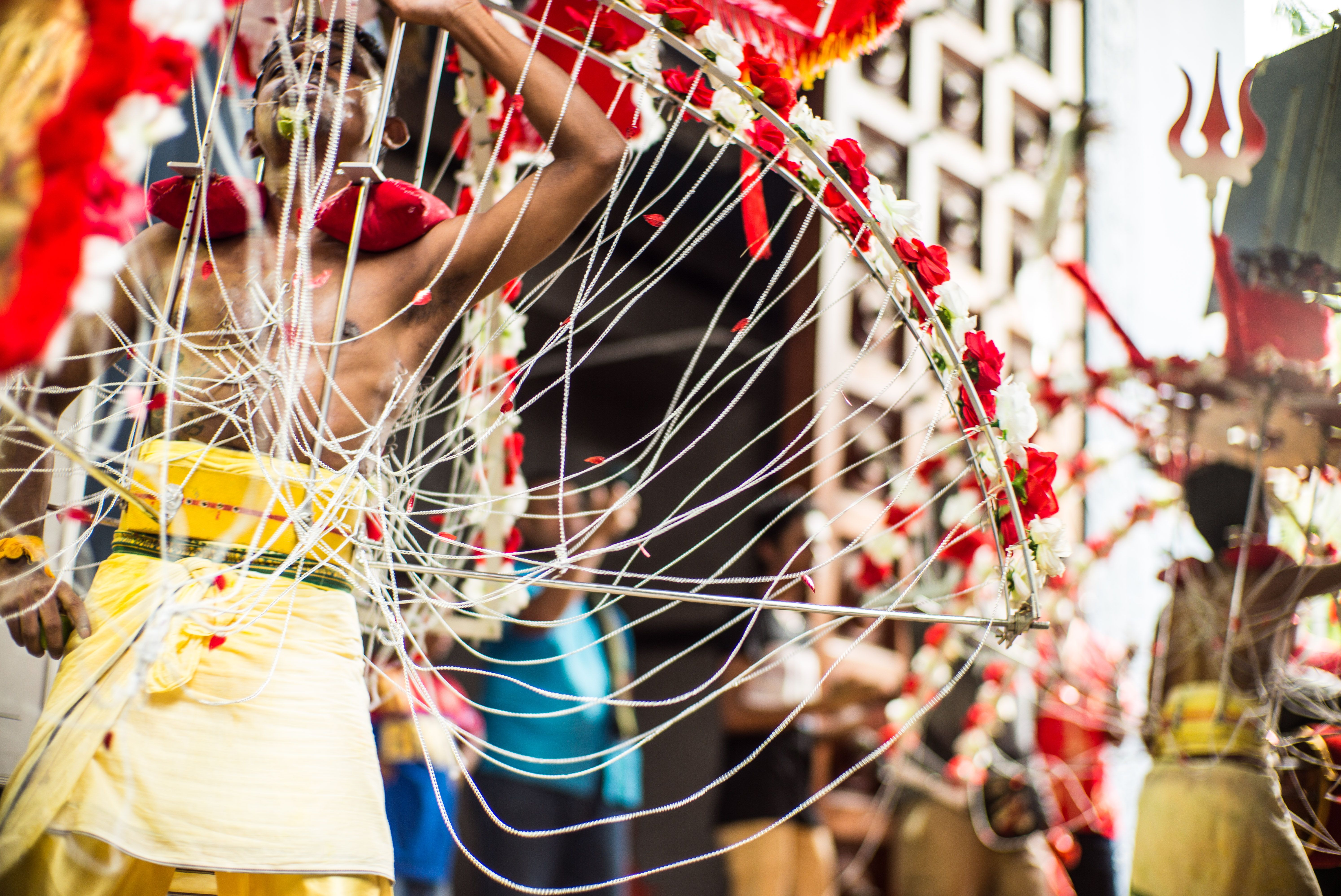 Originated from Southern India, Thaipusam is a temple festival celebrated by Tamil in Malaysia and Singapore, on January / Februeary each year. Often, sharp skewers are pierce through the tongues, cheeks and bodies of kavadi-bearers as a practice of self-modification. Carrying a kavadi is a form of seeking for forgiveness, keep a vow or offer thanks to Lord Murugan, it also translate as "sacrifice at every steps."