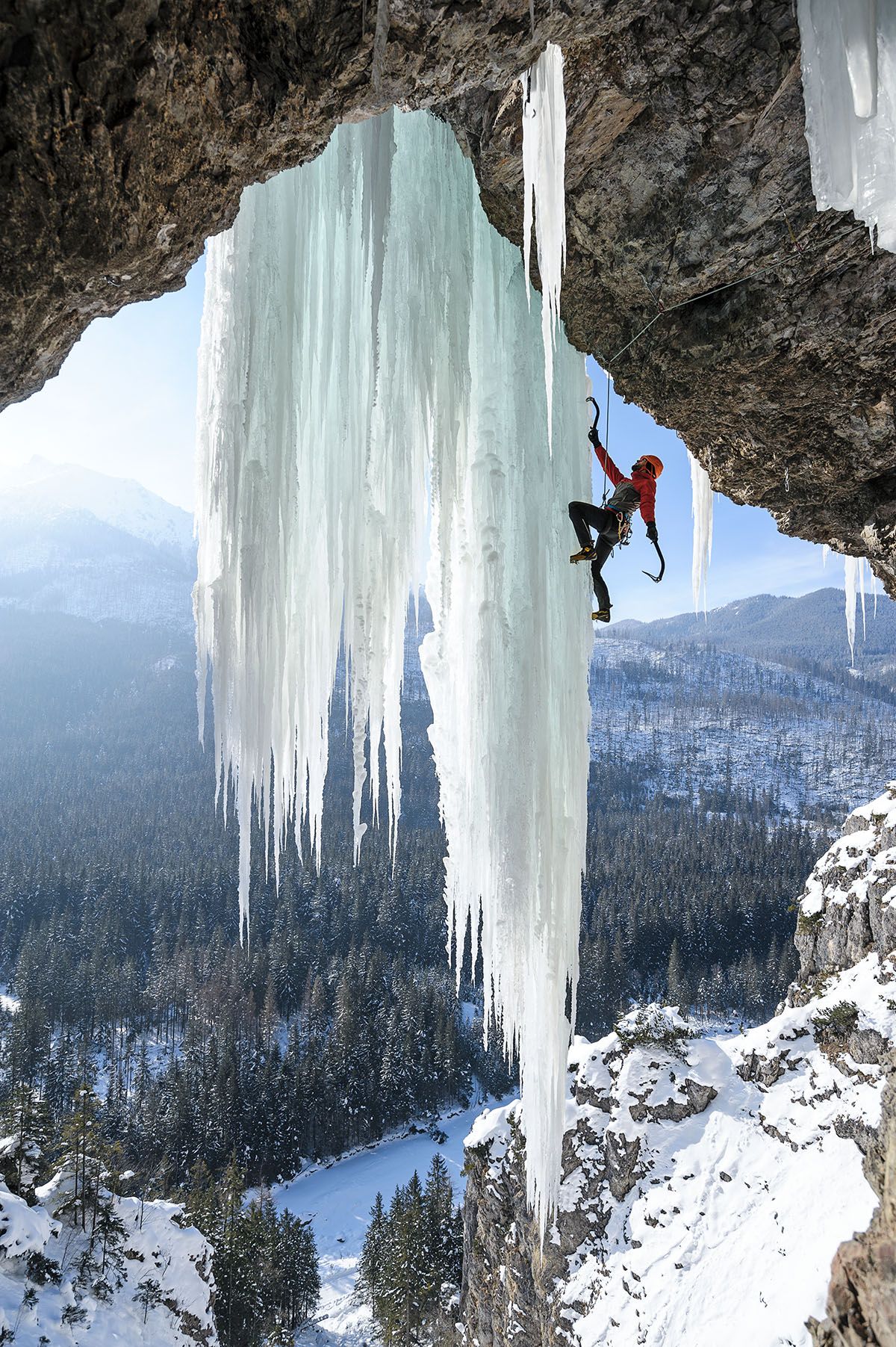 Krzysztof Rychlik is climbing on the icy curtain in White Water Valley in High Tatras.