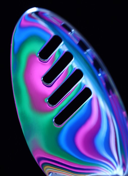 Advert promoting the slotted spoon. The reflections are coloured crayons.