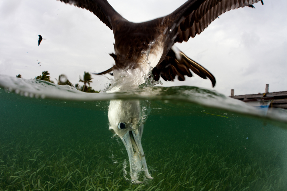 Magnificent Frigatebird feeding. This is an over/under image of a juvenile Magnificent
