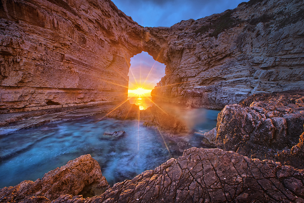 the rocky part of the Greek island Paxos.I Knew that the sun was down and through the big