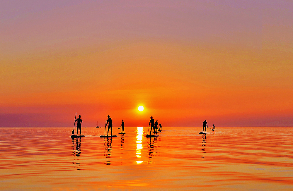 Group of surfers standing on the Slovenian coast . During return trips in kemp I came across a group of surfers presenetljvo the magical sunset .