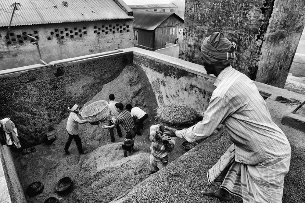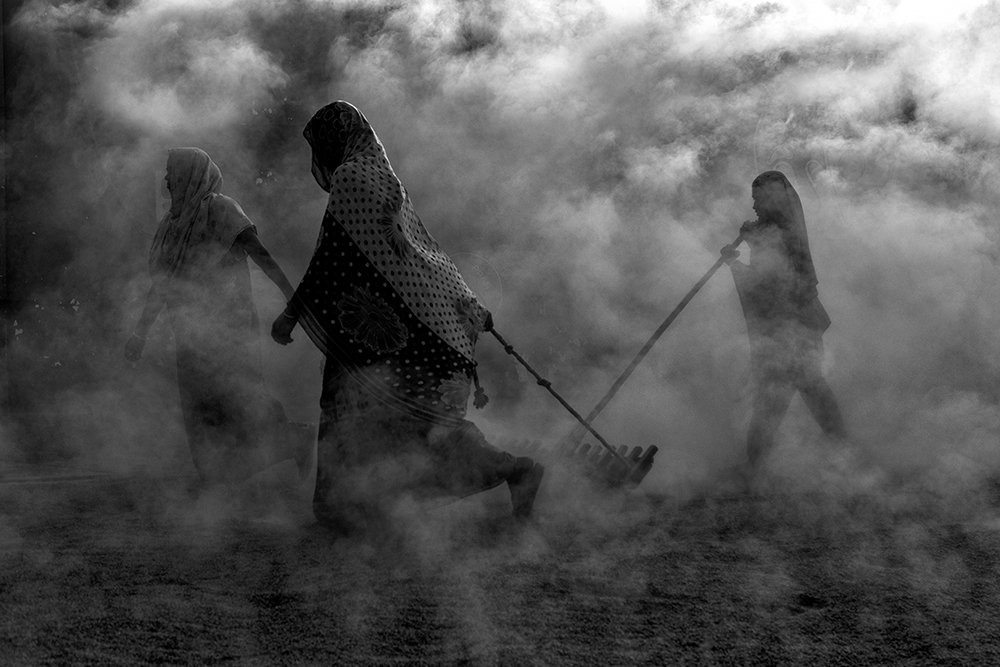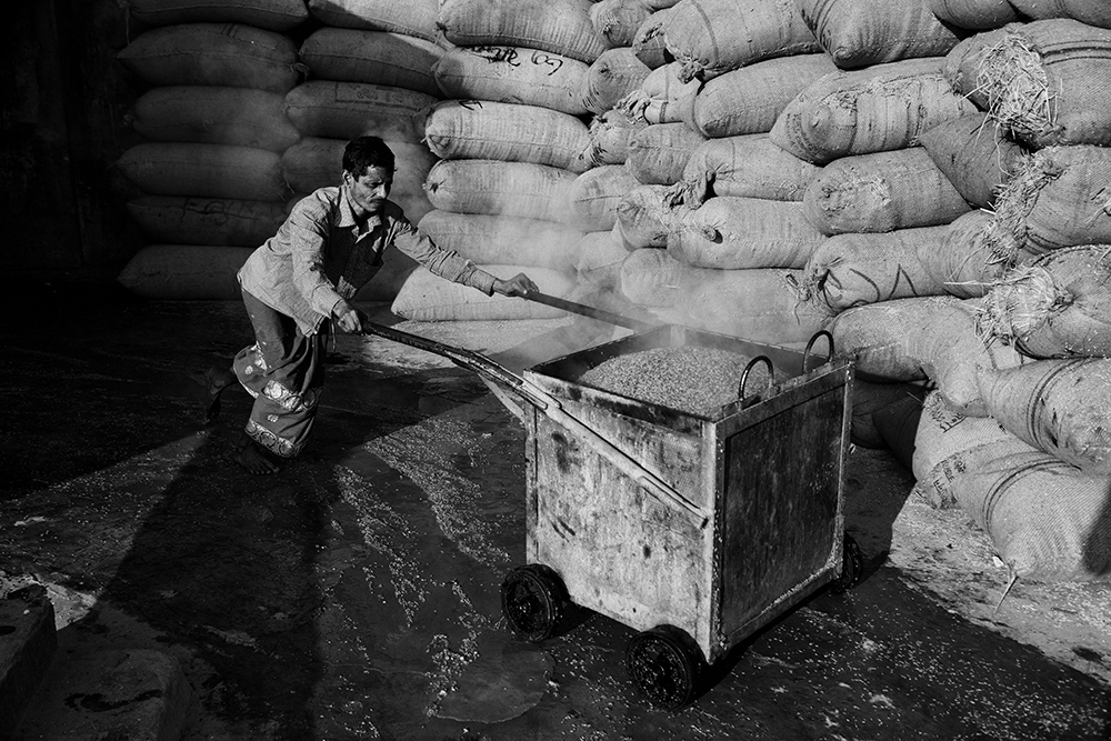 In Bangladesh the rice mill workers start their day at the break of dawn. While a group of worker boiled the paddy rice and others carry and spread on the floor of out side the rice mill to dry under the sun. By continue raking it out and then sweeping it back they make sure that dry process running properly. This is traditional methods of rice processing . Children live in the rice mill with their parents who work and earns live hood there. While parents working the elder one is taking care his younger sibling. Some of them play on the field during rice process. Some of them help their parents during work. There are 300 boiler rice mills in Ashuganj and about 60 in Bhairab and nearly 12000 female work in those rice mill.