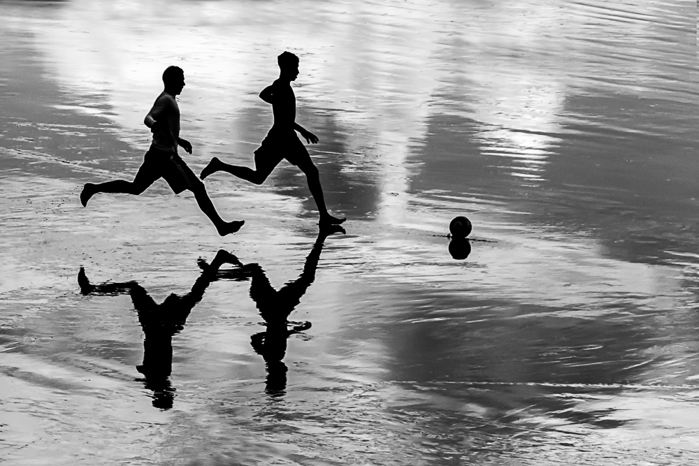 Shows silhouettes and reflections of people playing football on the beach.