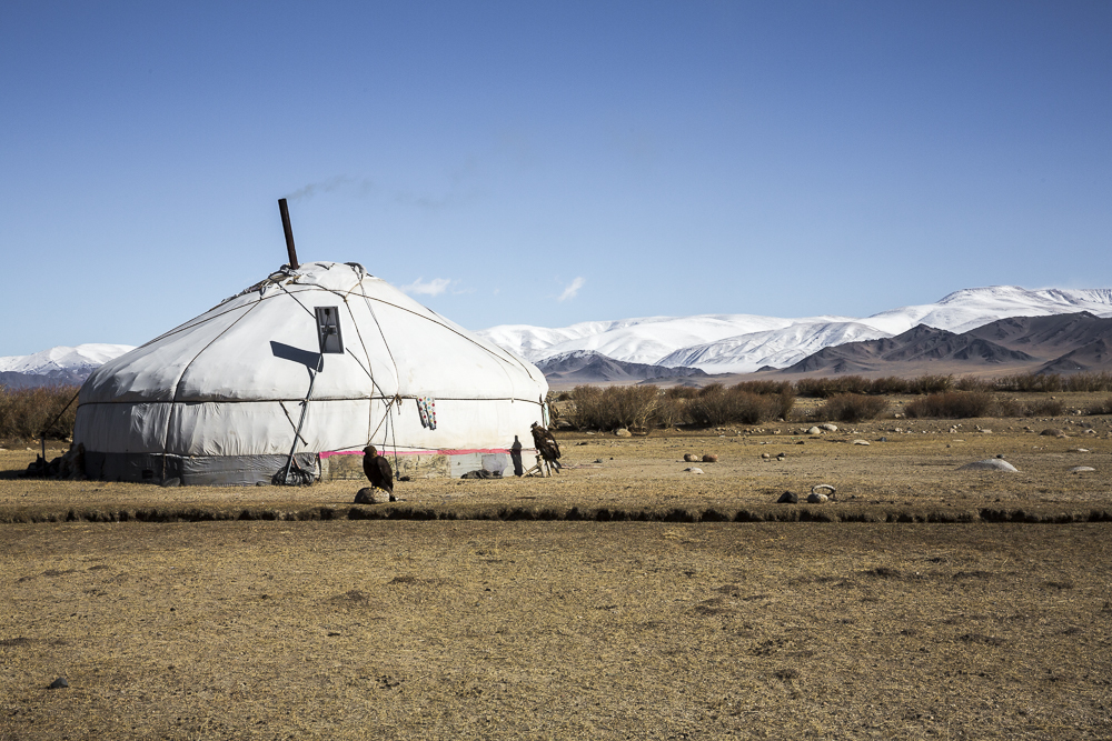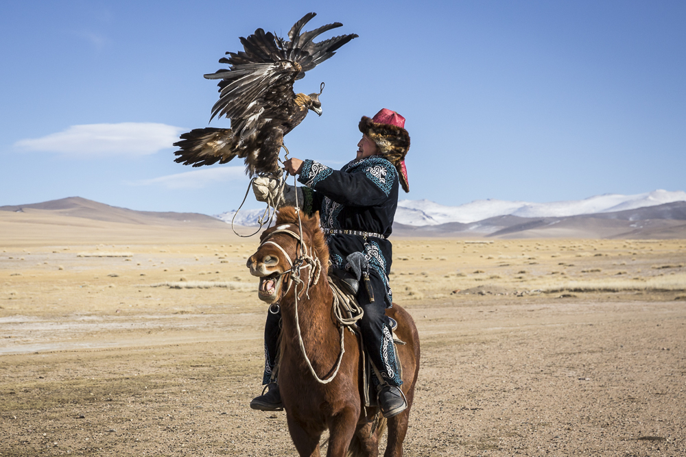 Kazakh nomads use golden eagles to hunt on horseback. This