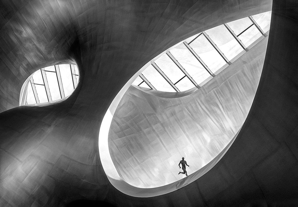 This photograph highlights the modern architecture of Arnhem Central Station in the Netherlands by using black and white technique and the movement of the runner in the static scene.