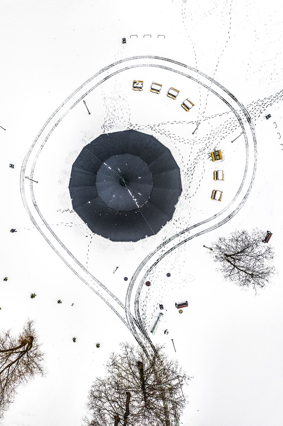 The picture shows the graduation tower in winter in my hometown of Rybnik. Snow and the perspective from the air showed how surprising and amazing forms are stuck in places that we do not pay attention to in normal circumstances.