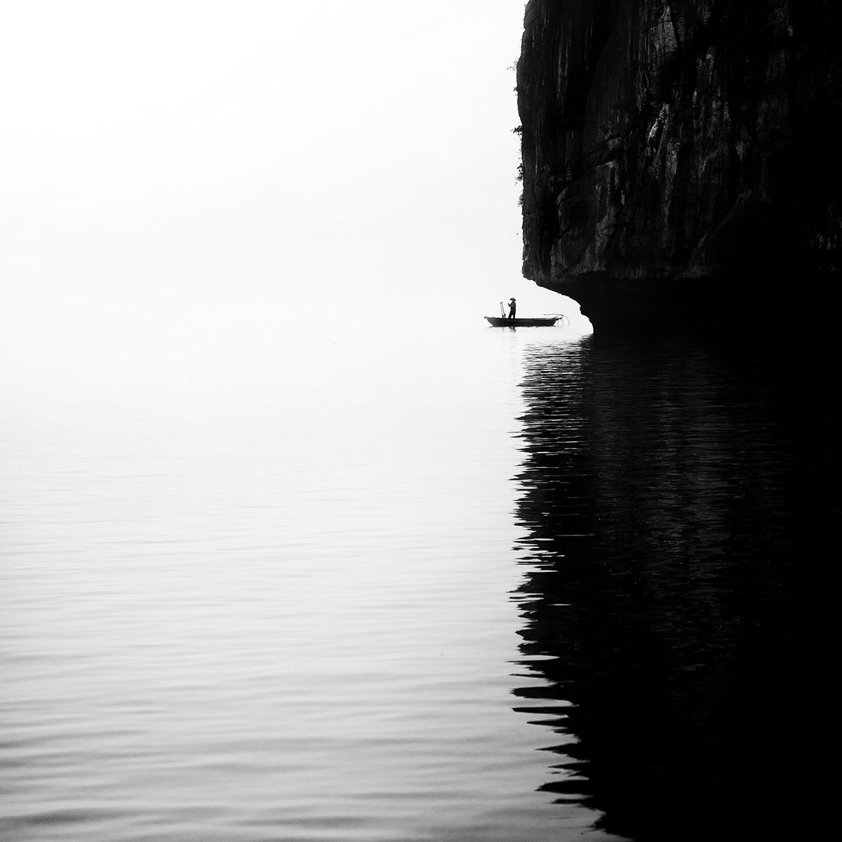 picture taken in Vietnam far away from the crowd in south halong Bay. Fisherman look like in symbiosis with the nature