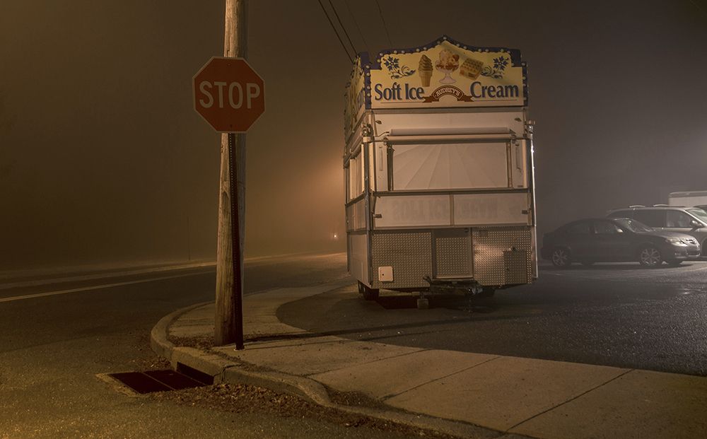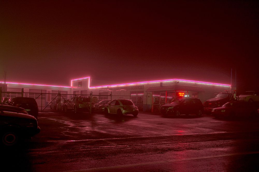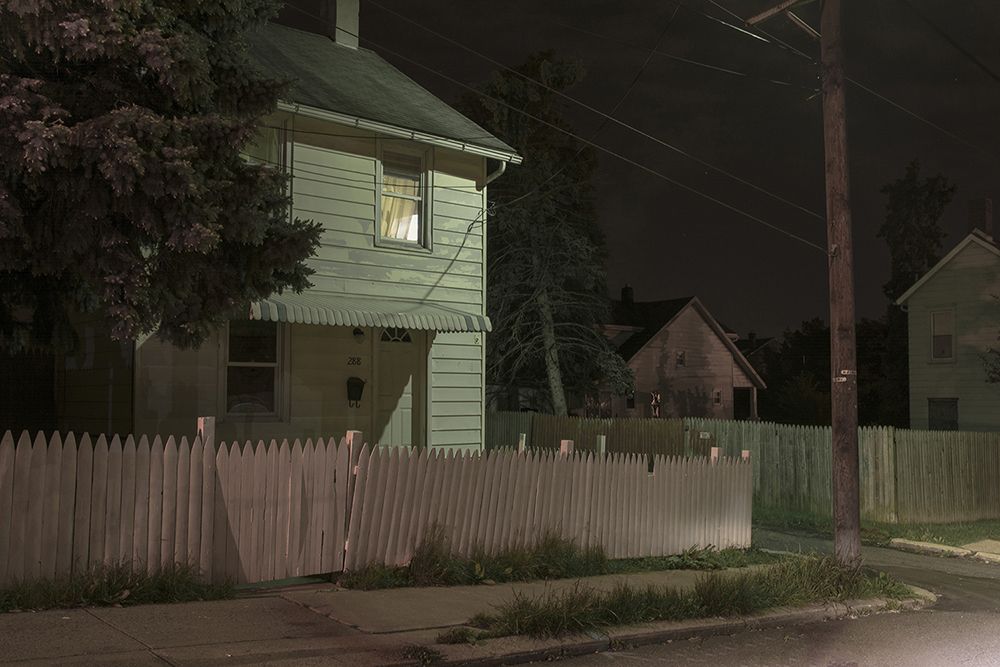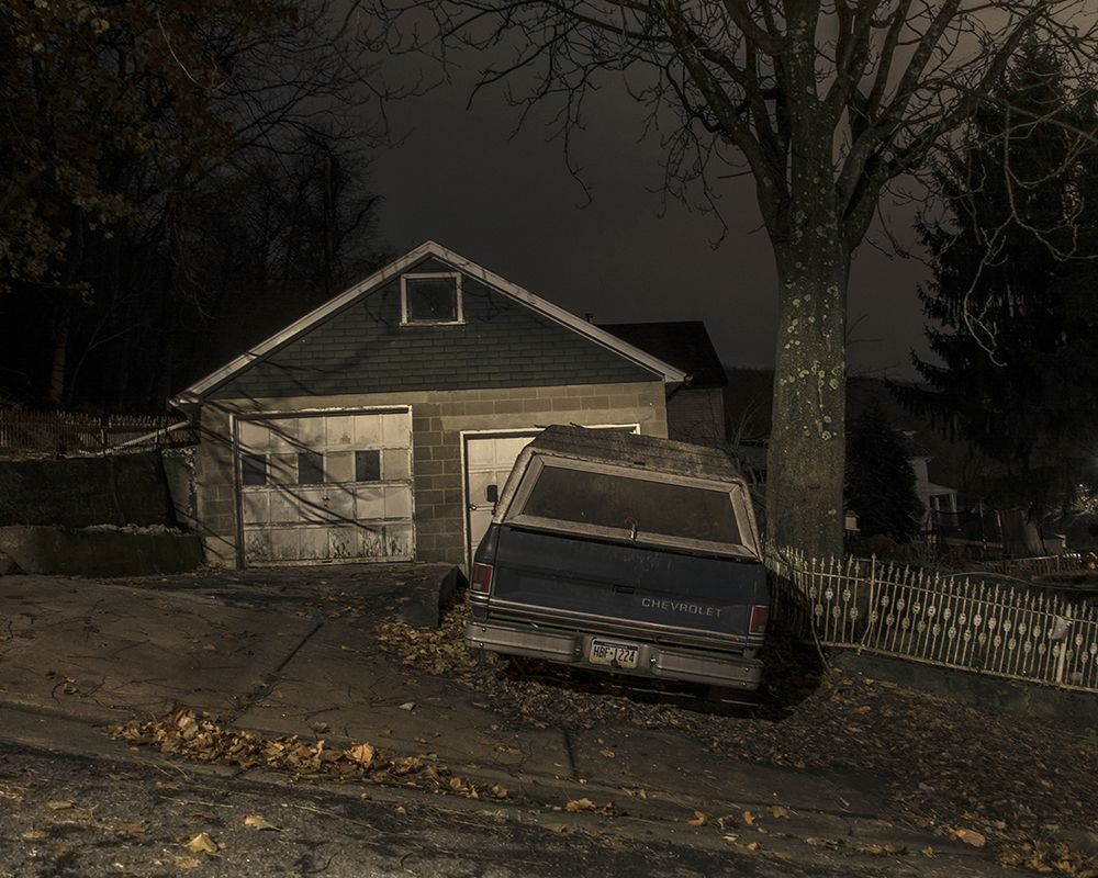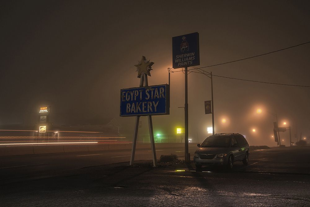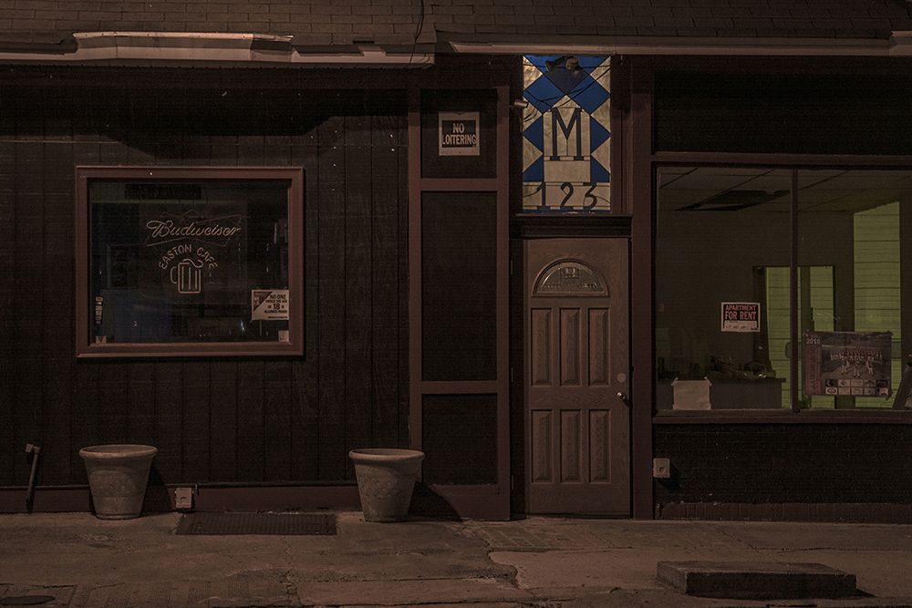 Easton Nights is a story which grew from the unique and uncommon valley in which the city lies; and is told with the images of unpeopled landscapes taken at night. Here, in the small hours, the world we see as mundane, cascades into dream. Like a surreal scene from a Guillermo del Toro film, trash bins and Toyotas, stop signs and doorways; all become animated. They lean; they stretch, and emanate, all with umbrageous hues, which seem to exhale from the nights own personal color wheel. Complete they are a mimesis of our daily life, shown in the mystical emptiness of night