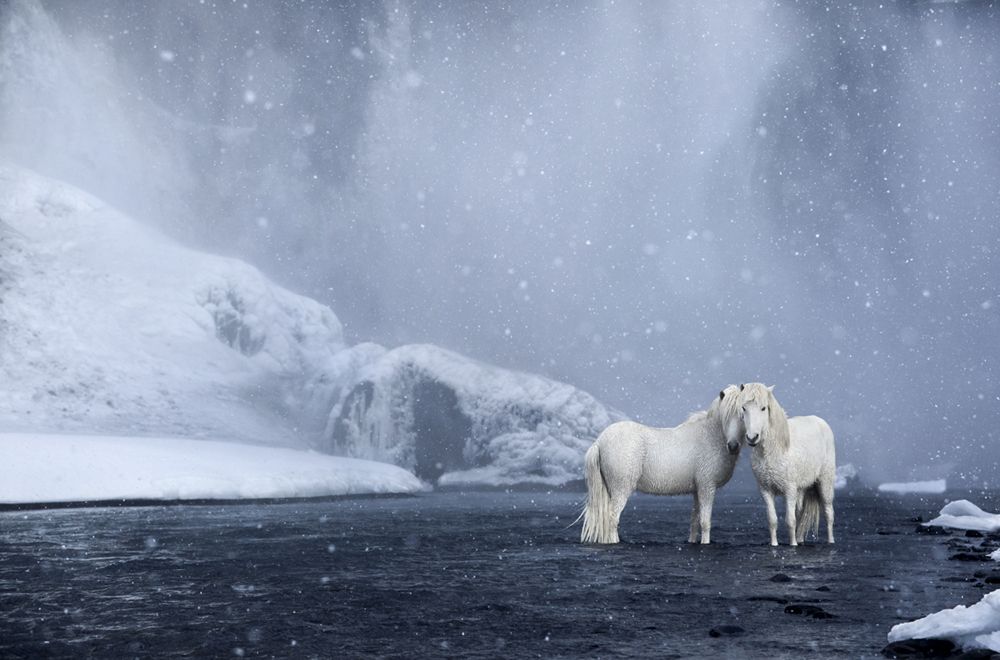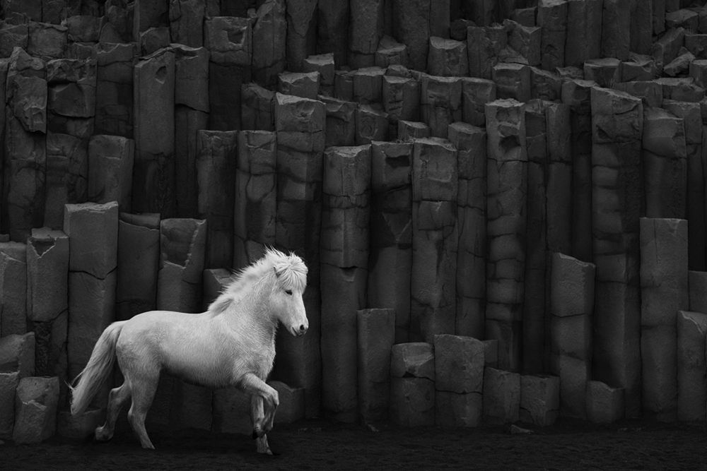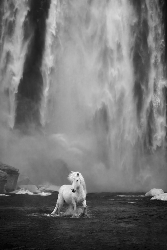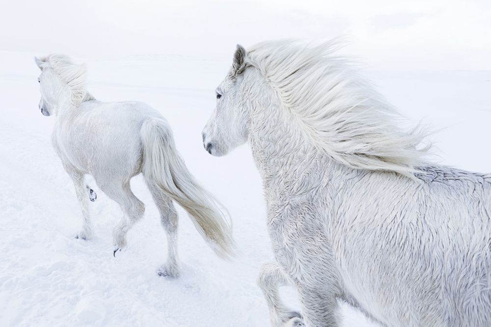 The works in "In the Realm of Legends" tell the intertwined story of the Icelandic landscape and native horses. While Iceland’s weather is extreme, often changing from hour to hour, the horse’s ability to thrive within this ever-changing ecosystem is innately embedded in their DNA. This breed is the original Viking horse brought to Iceland with its very first residents, so these animals have grown accustomed to the awesome yet daunting land. Together, the two have a rich history that creates one cohesive yet visually near-unbelievable narrative.