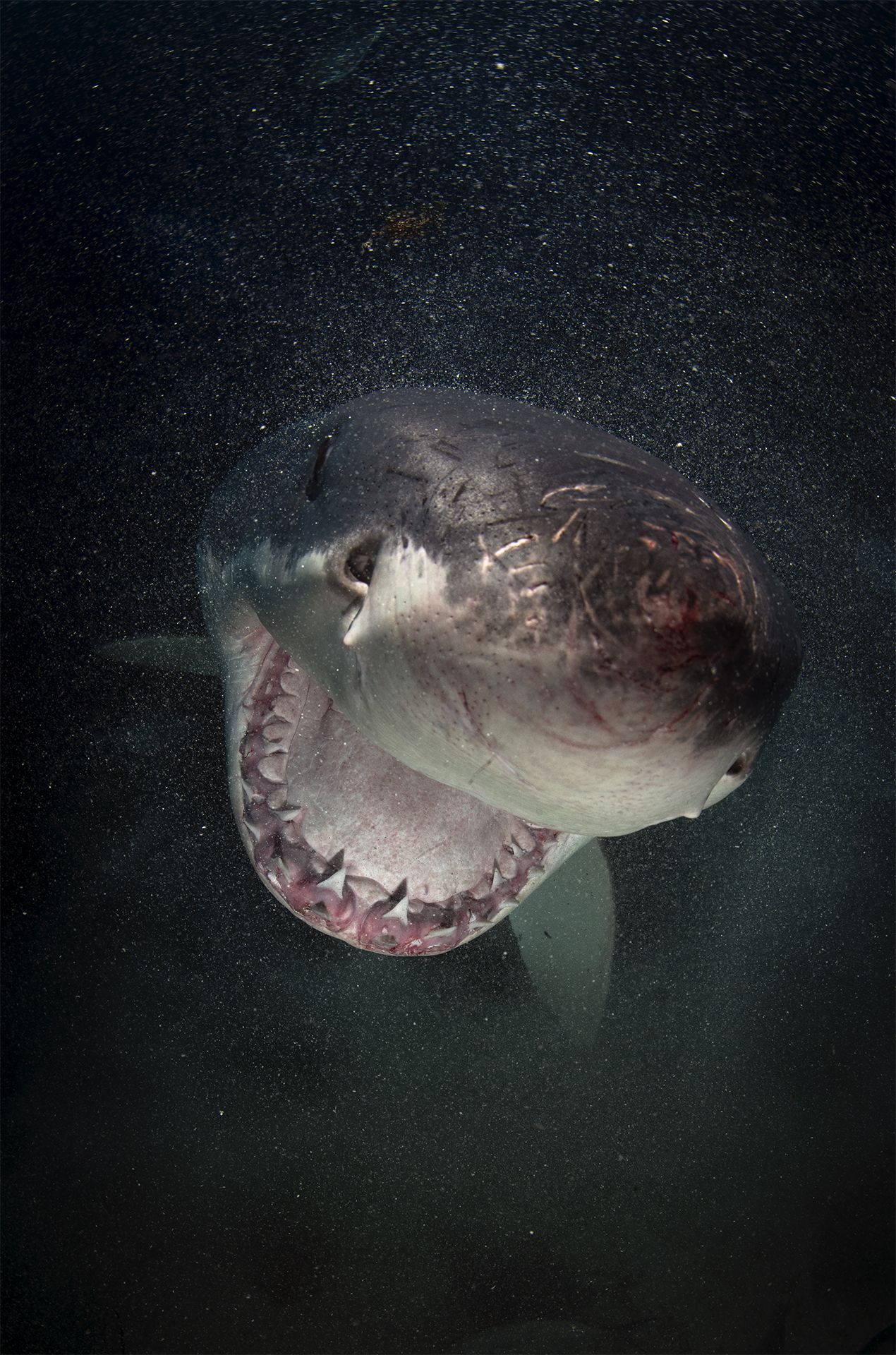 The ultimate ambush predator, the great white shark, explodes out from the cover of darkness, whipping up a sandstorm as it engages itsÕ prey. Juevenille white shark - Neptune Islands, South Australia