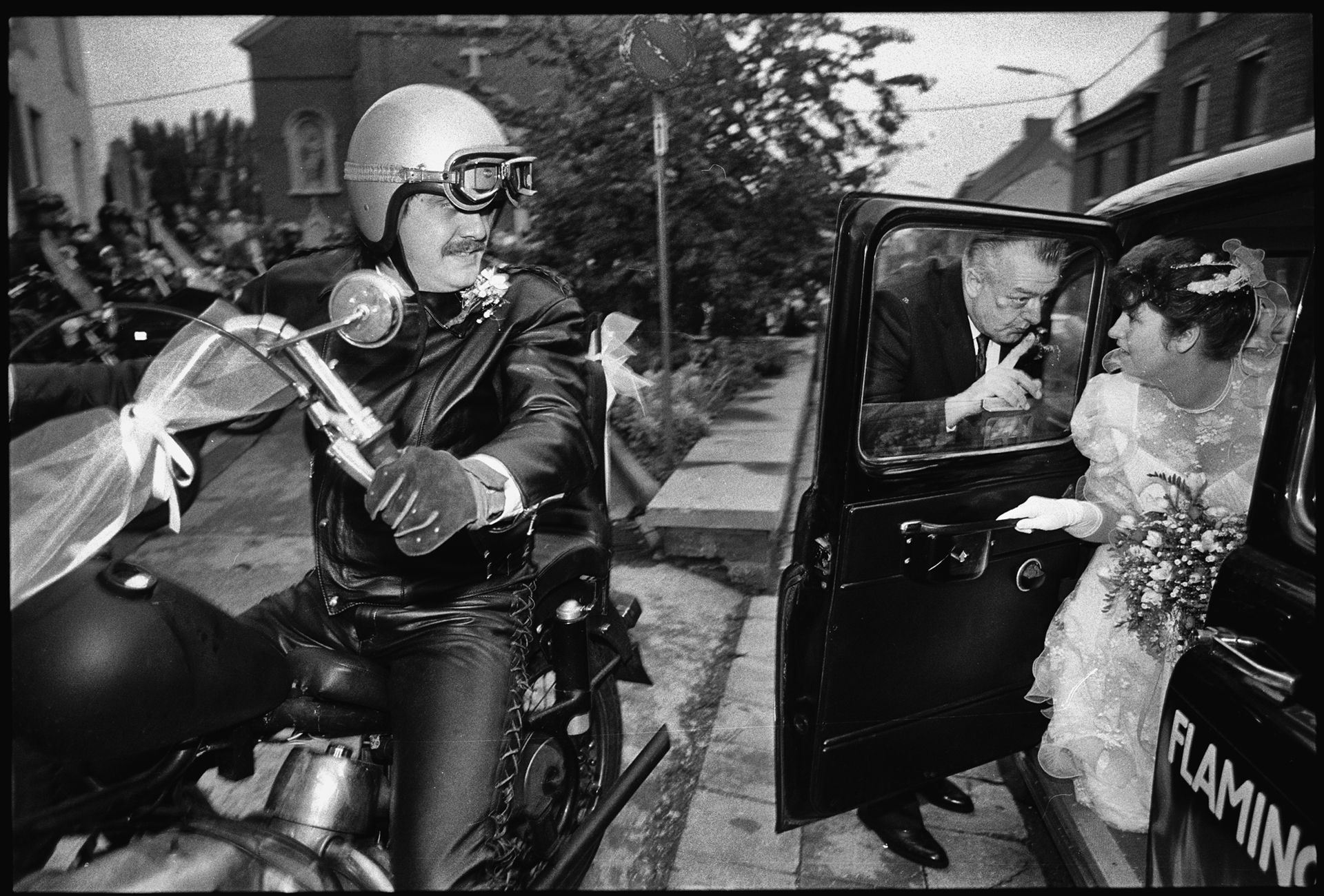 A biker couple on their wedding day. As the bride steps out of the London taxi, her father offers some last minute advice that amuses the groom.