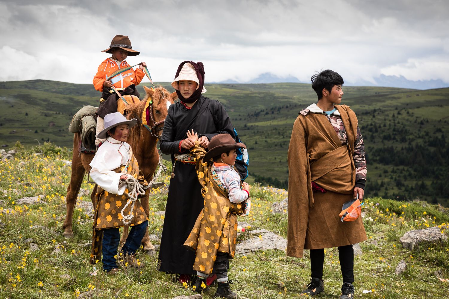 This Tibetan family is preparing for the long ride home after spending the day at the traditional horse racing festival, where nomadic Tibetan families gather high up on the Tibetan Plateau (4200 meters) to watch local Khampa horsemen compete in various horse races. Everyone is dressed in their best Tibetan outfits, with some modern accessories. I watched as the mother of this family helped her exhausted three young sons climb on the horse's back, while she and her older son held the reins and led the horse across the grasslands and the long walk home.