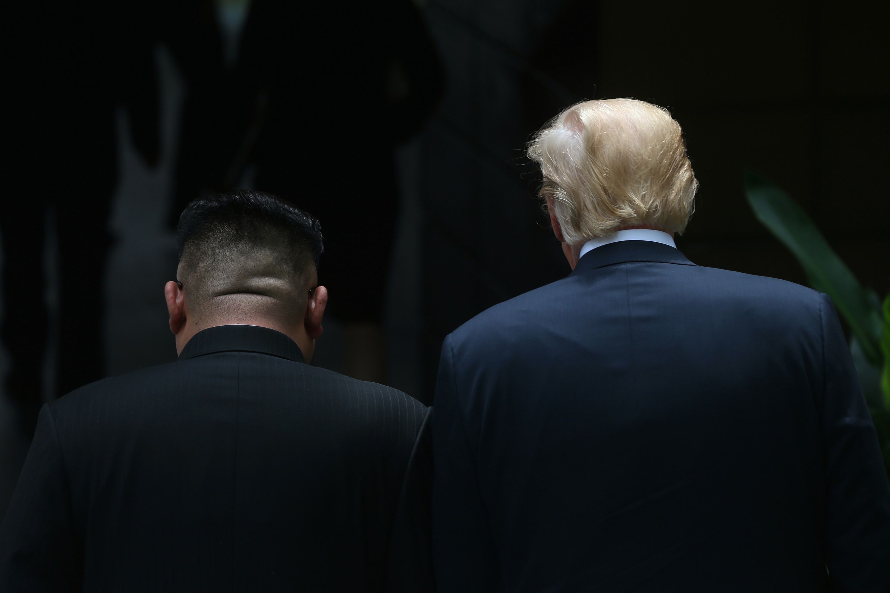 US President Donald Trump (R) and North Korean leader Kim Jong Un strolling through the courtyard during a summit at Capella Singapore on Jun 12, 2018. Held in Singapore for the first time in her history, the Trump-Kim summit was also the first meeting between US President Donald Trump and North Korean leader Kim Jong Un. The historic summit resulted in a vaguely worded deal towards denuclearisation.