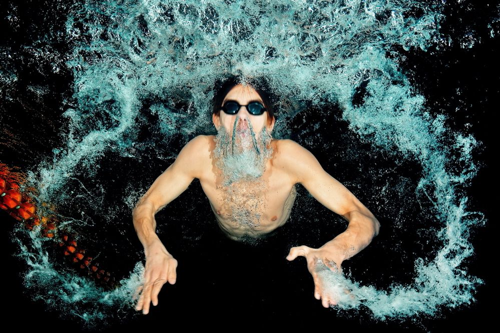 Butterfly style swimming at training. I took this picture of a member of KASI (Sport School of Kaposvár) to analize his movements. Out of all the swimming styles, the butterfly was the most beautifully captureable with short exposure time. The air that his palms bring underwater draws out his hand movements, while the air he breaths out through his nose brings more dynamics into the photo. To make everything stand out better, I exposed a dark background to the picture.