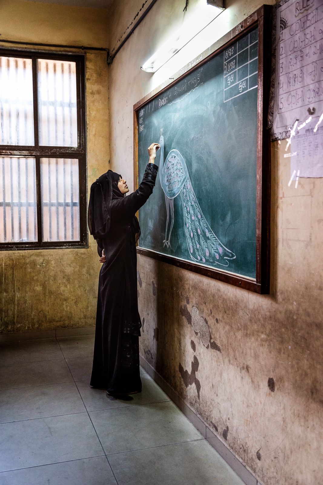 In this school the teacher had just drawn a peacock: her gestures appeared as elegant as the drawing on the blackboard