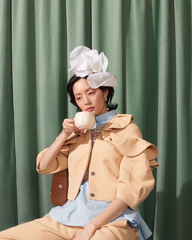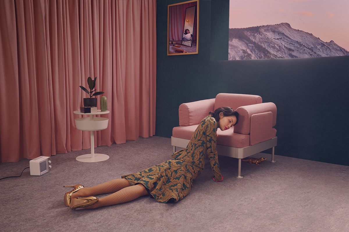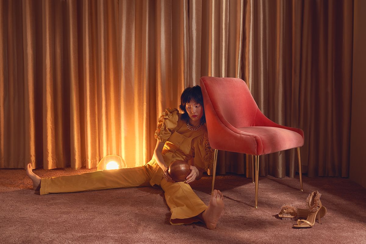 Inspired by Atelier Aveus’s furniture collection emoting visual codes for waiting, this series follows a young woman displaced in a waiting room in the midst of travel. In this room, she is alone and begins to feel the mania of “contemplation, passivity and the distortion of time.” Our lighting + set were designed to emphasize the tension between patience and impatience, calm and frenzy. Here, the wait serves as a metaphor for the paradox of poise occurring in feminism, where woman is trapped in dichotomy between prim and primitive, grace and freedom, a bird in her own cage.